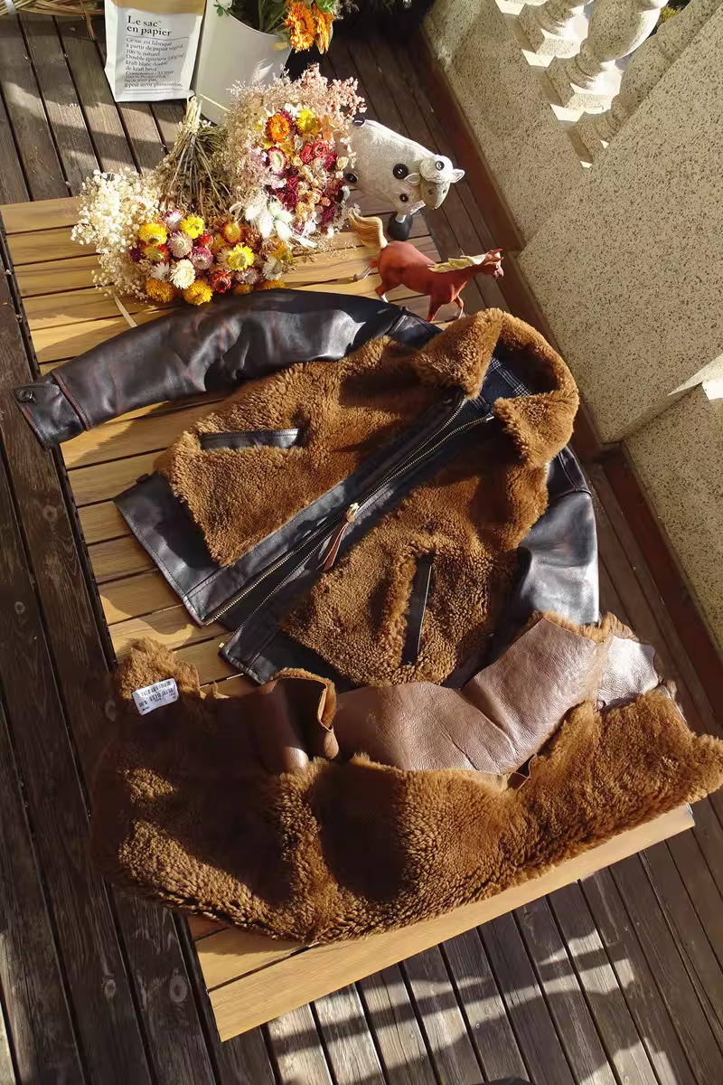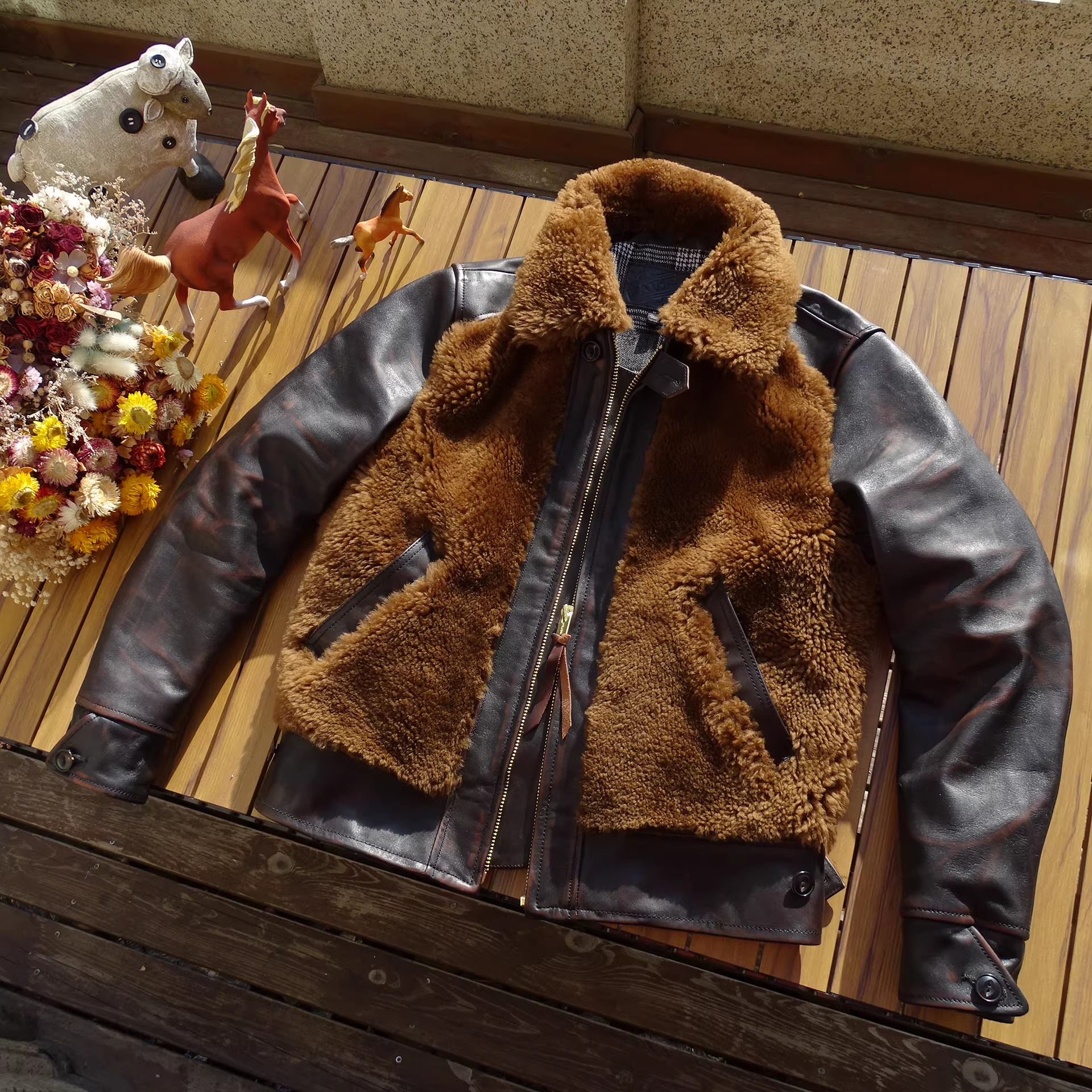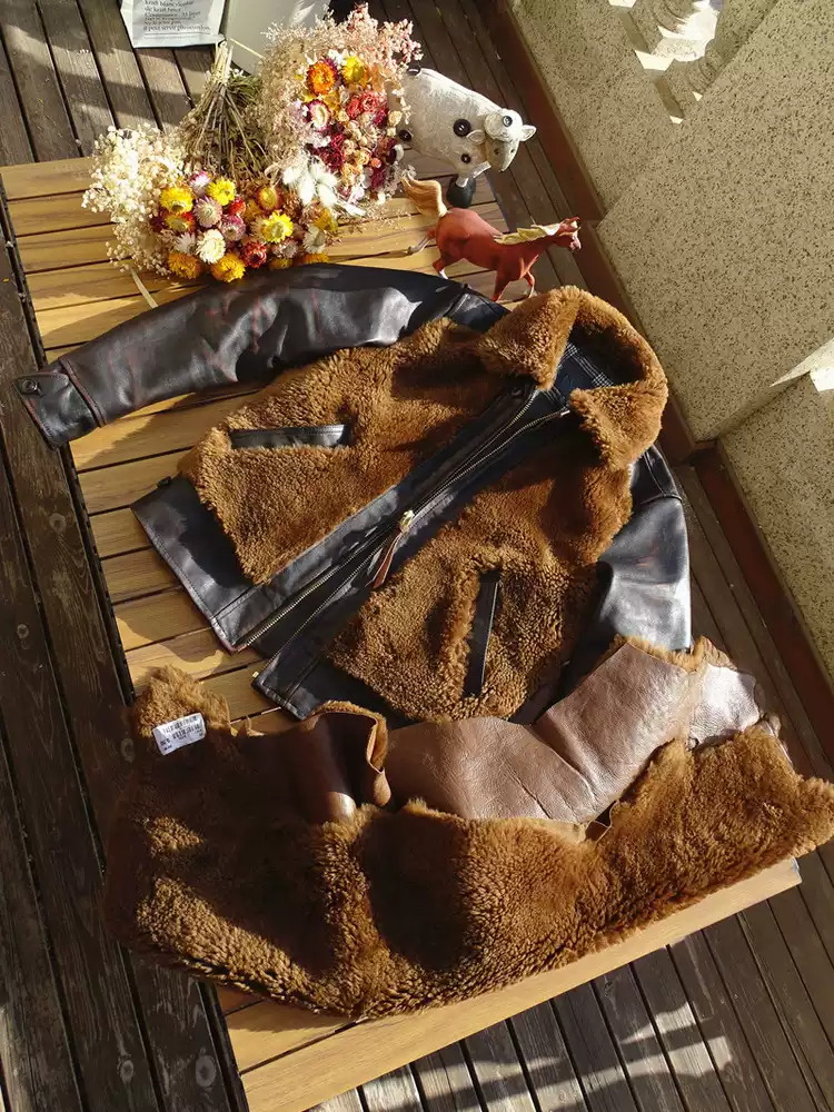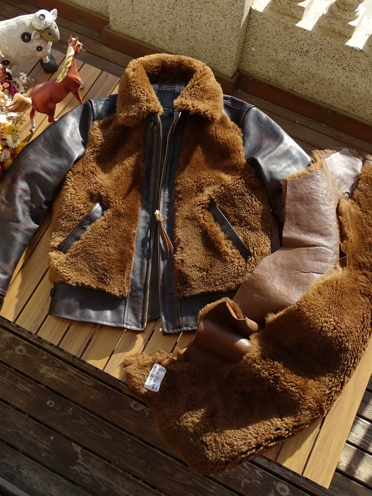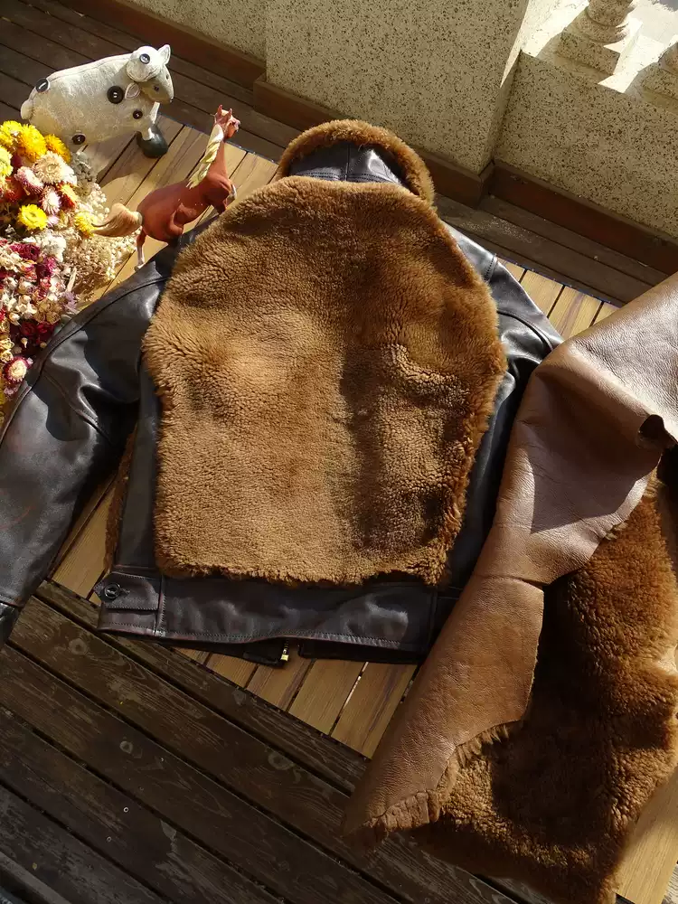 [써니레더] 램스킨 퍼 & 홀스하이드 그리즐리 자켓 - 테디 베어 브라운