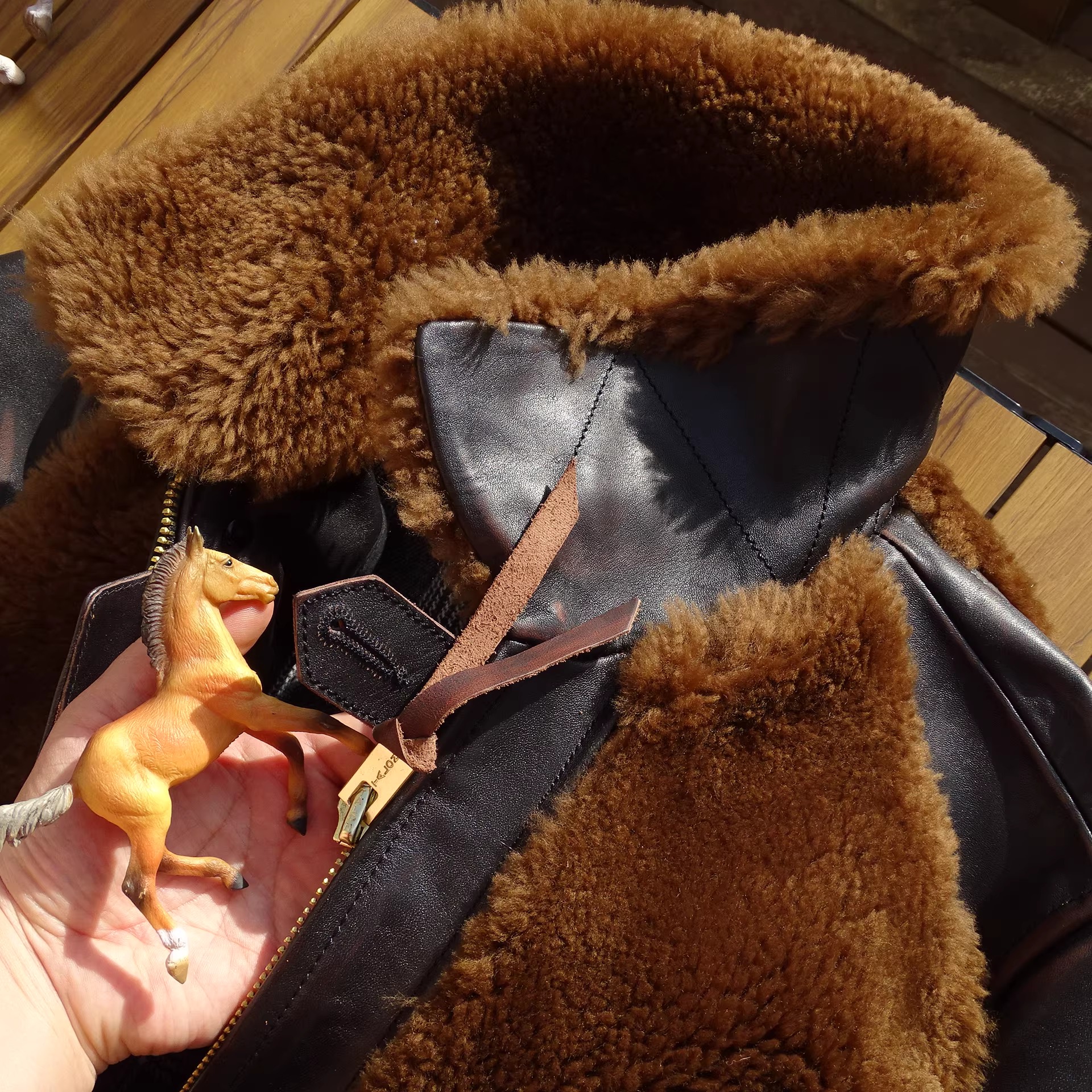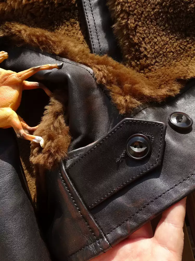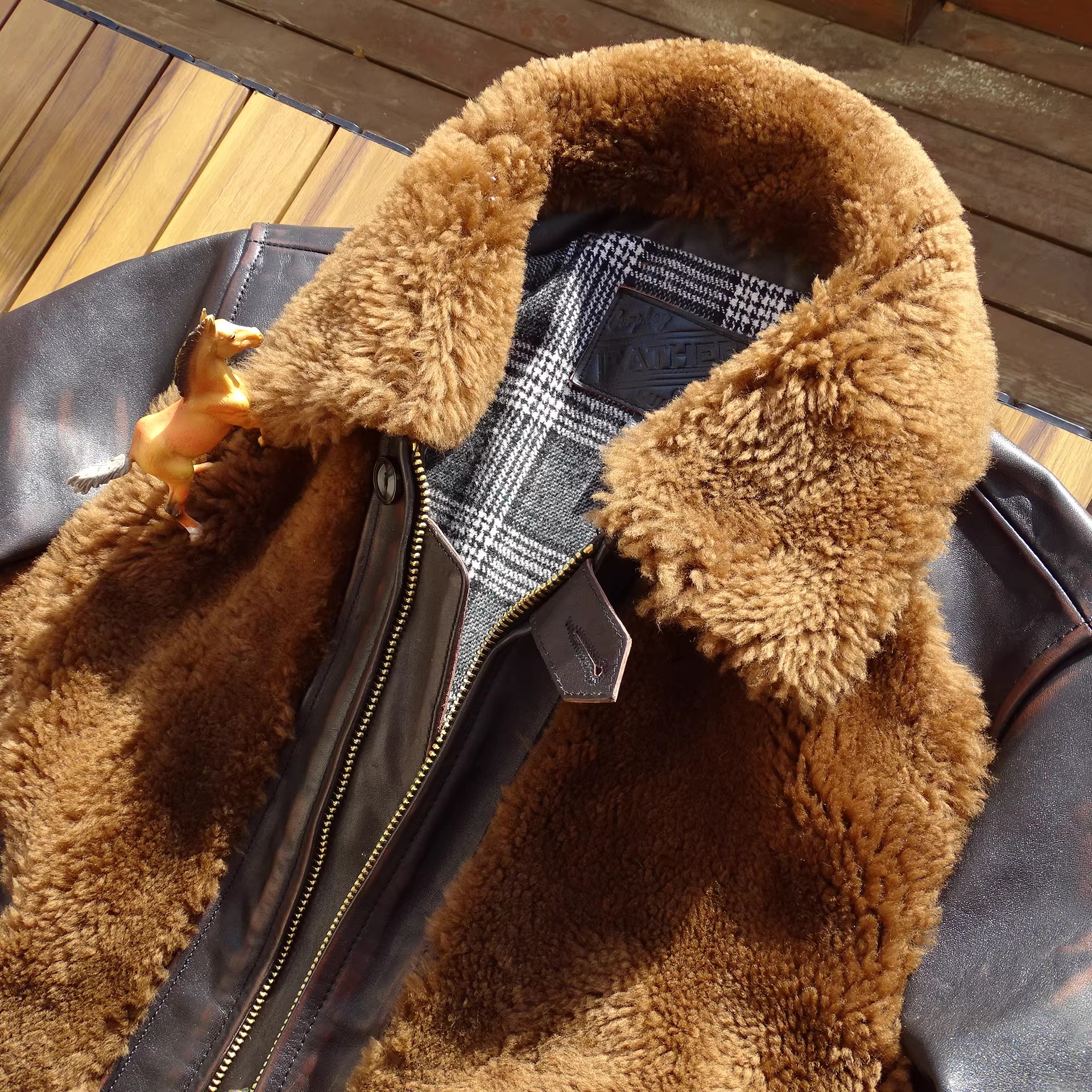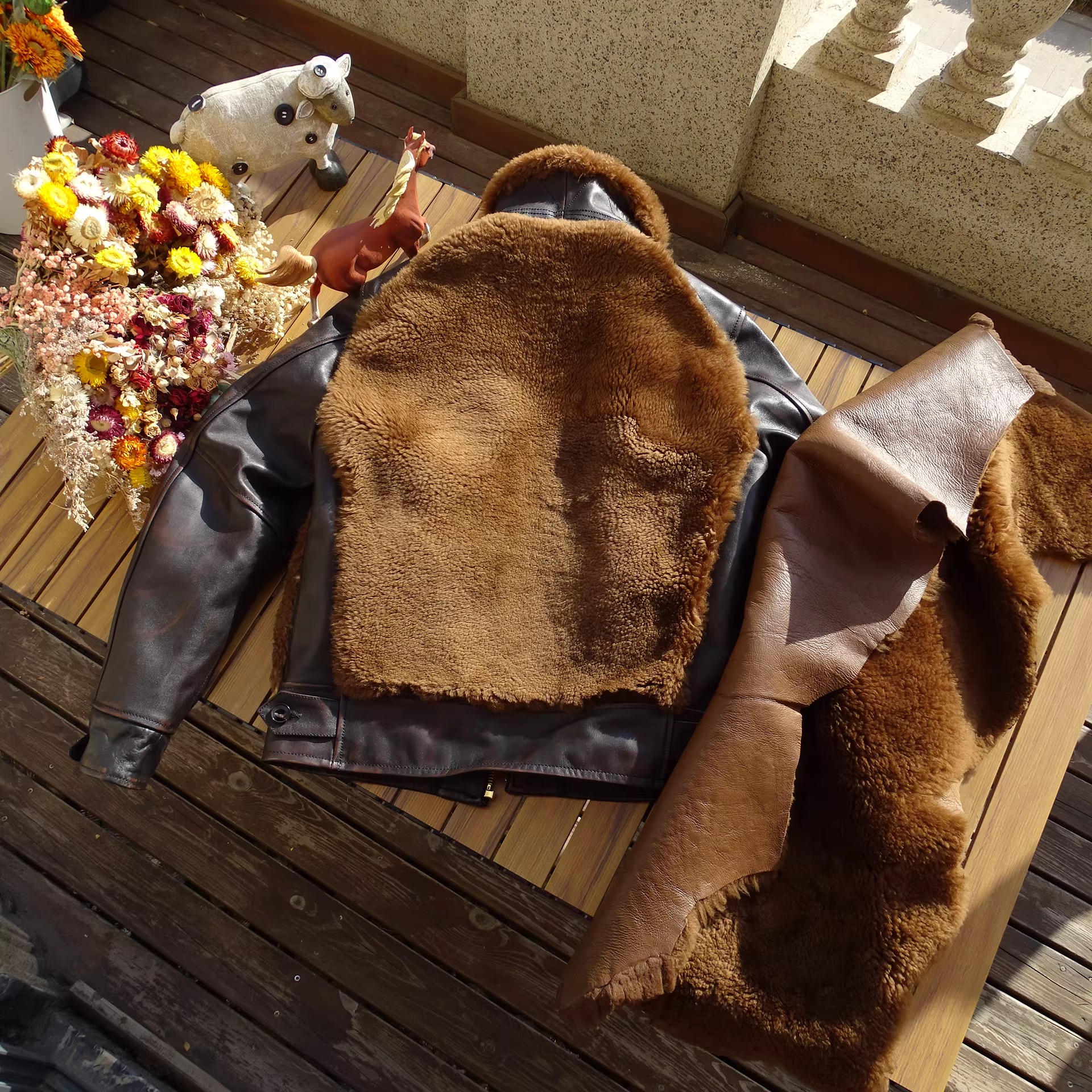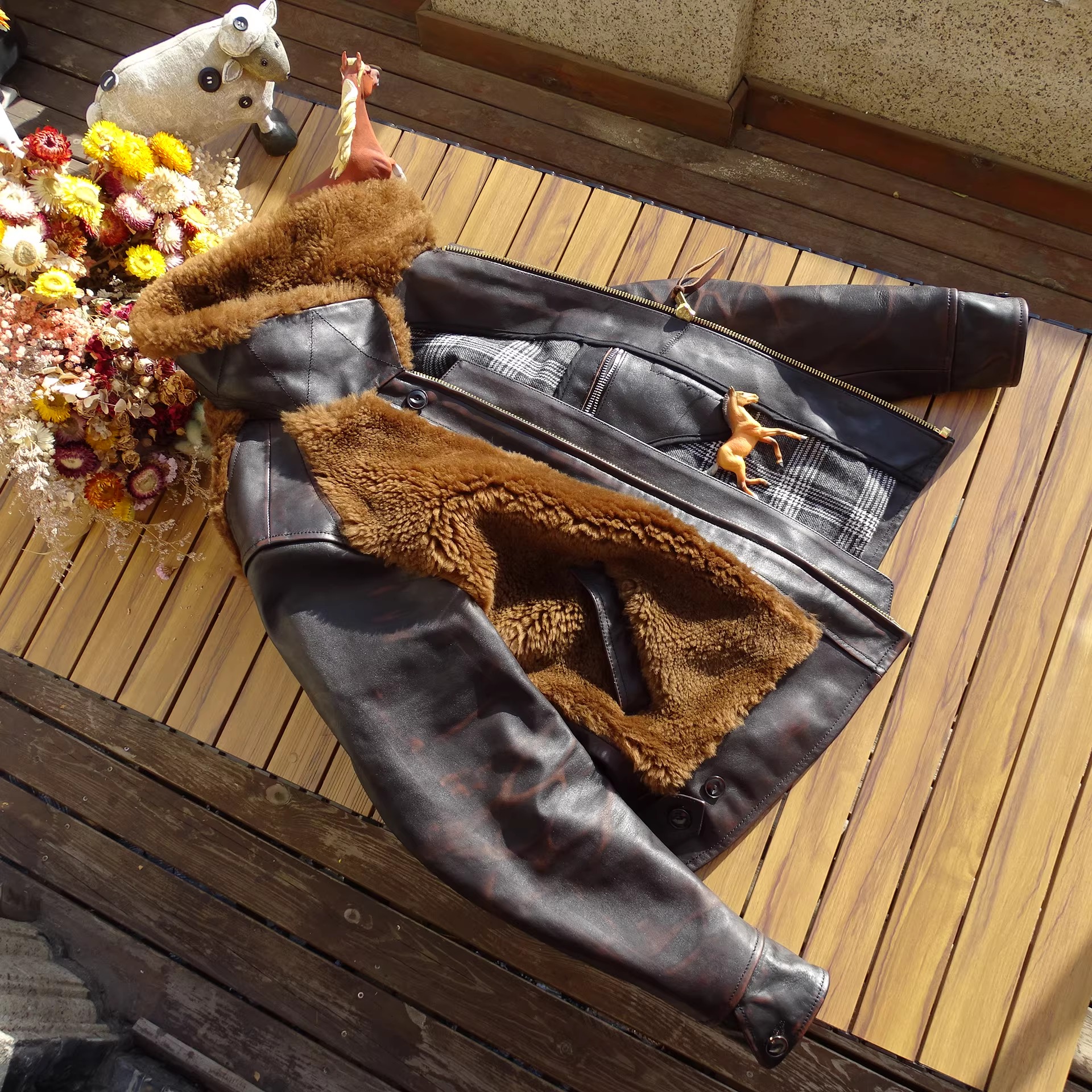 [써니레더] 램스킨 퍼 & 홀스하이드 그리즐리 자켓 - 테디 베어 브라운