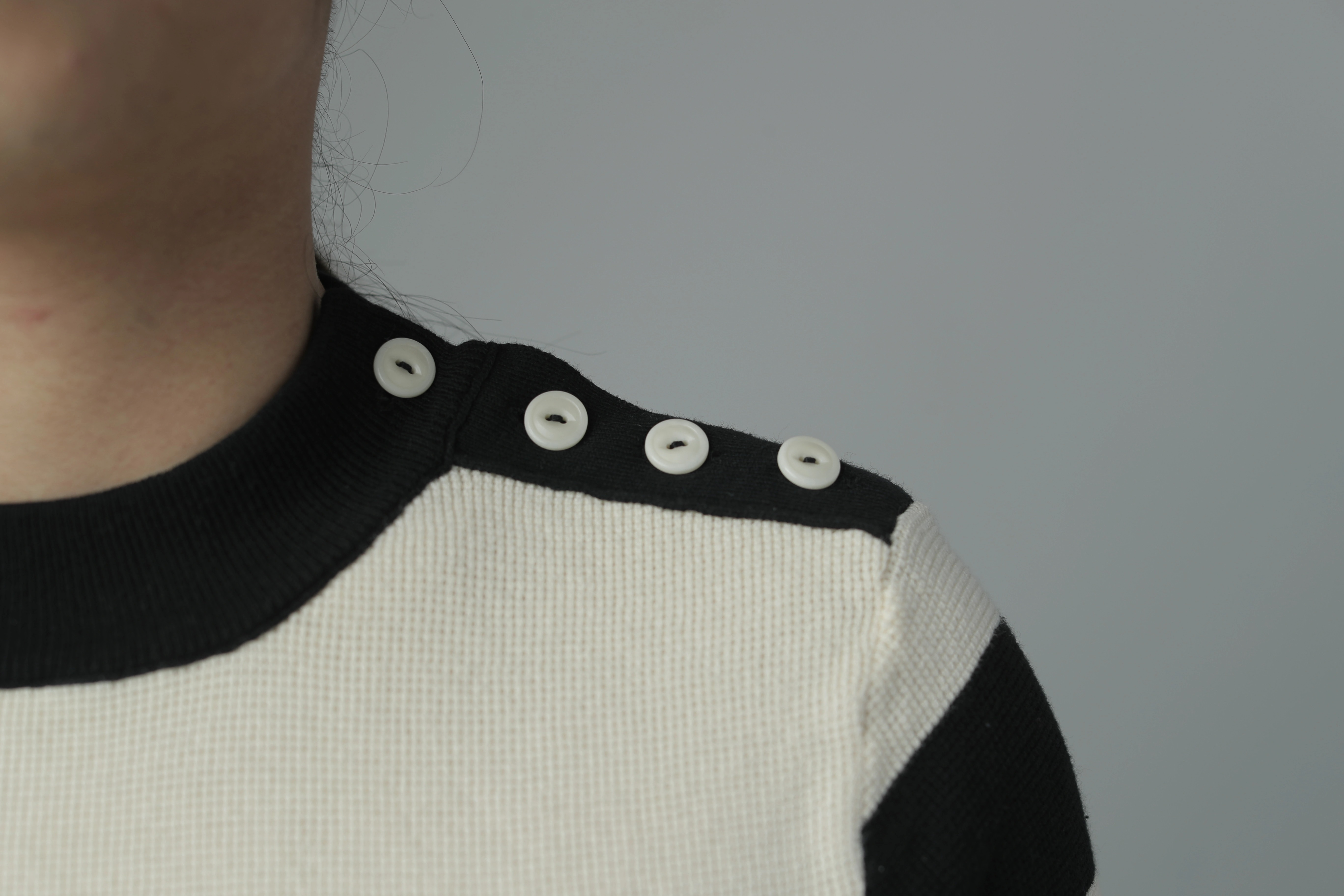 • 어깨 라인에 유니크한 언밸런스 버튼 디테일