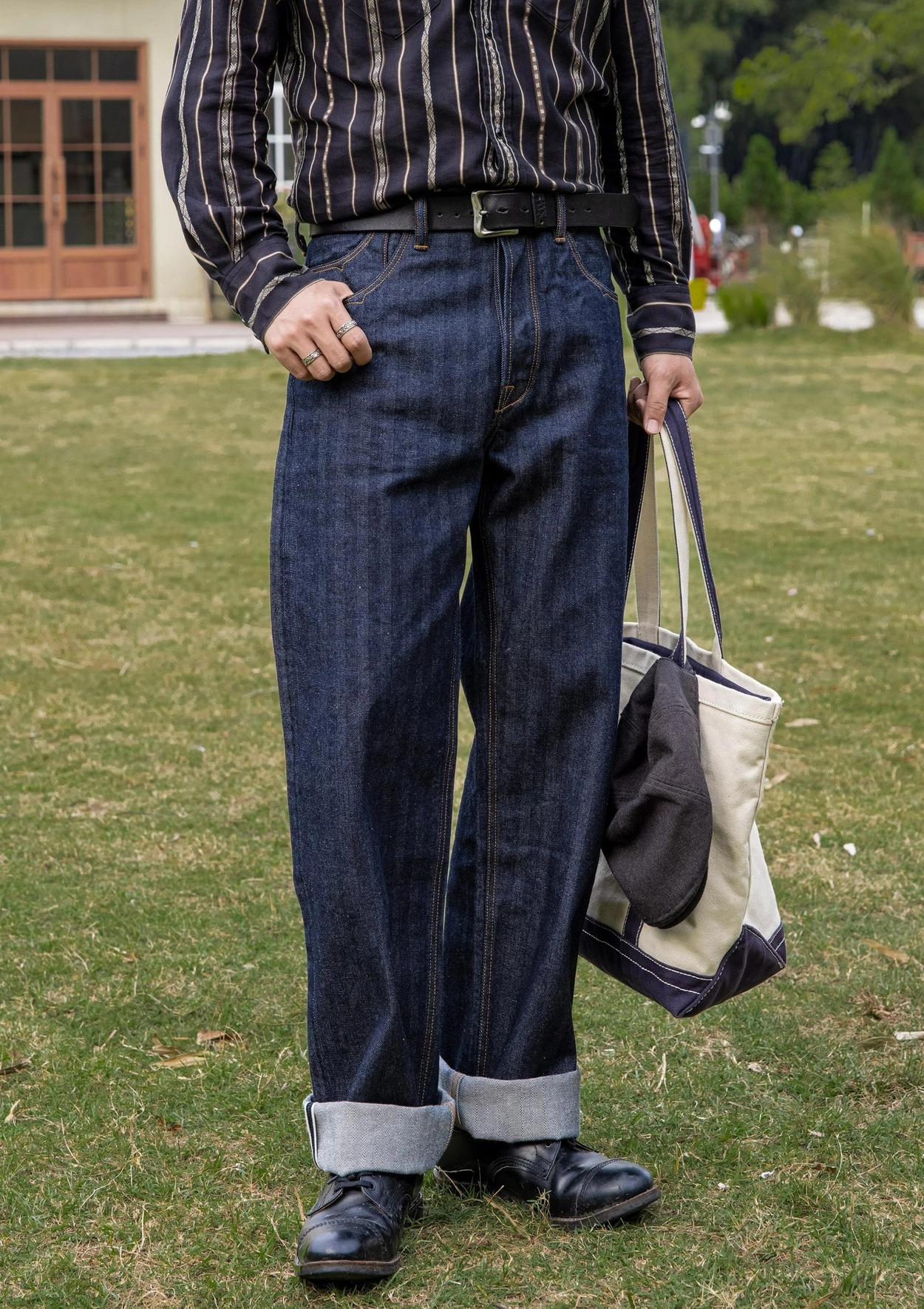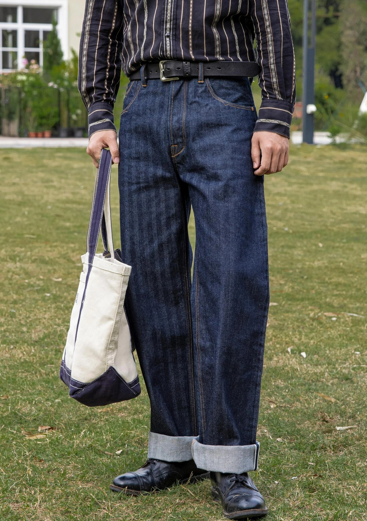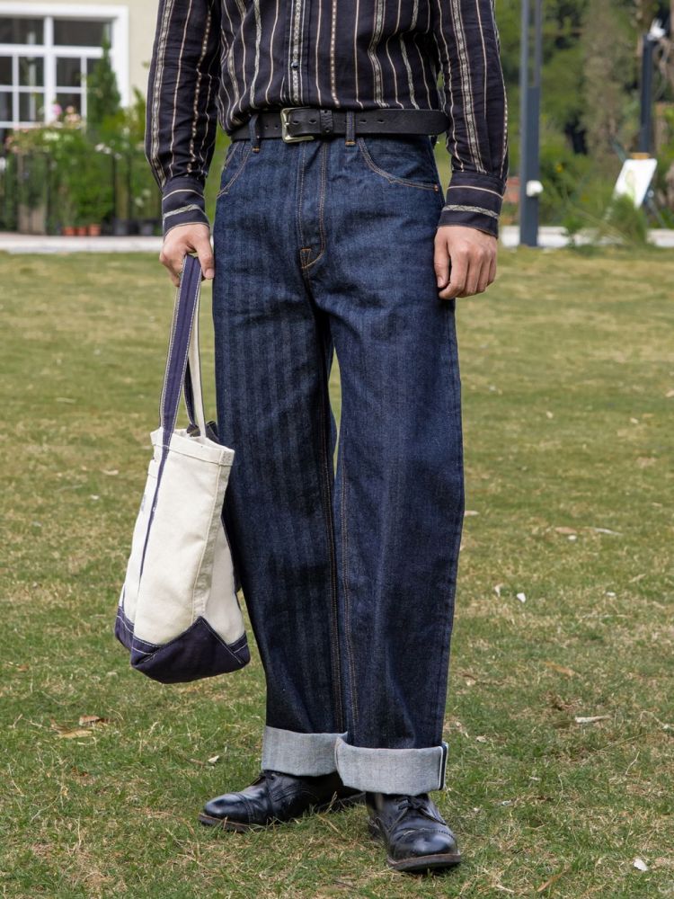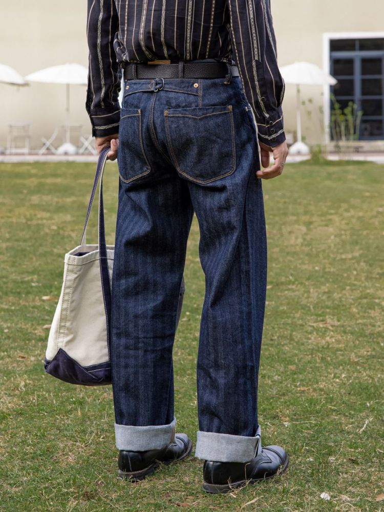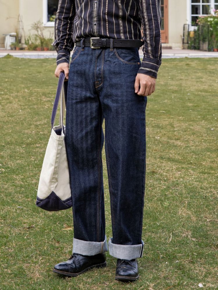 • 견고한 헤링본 패턴이 돋보이는 와이드 데님 팬츠입니다.