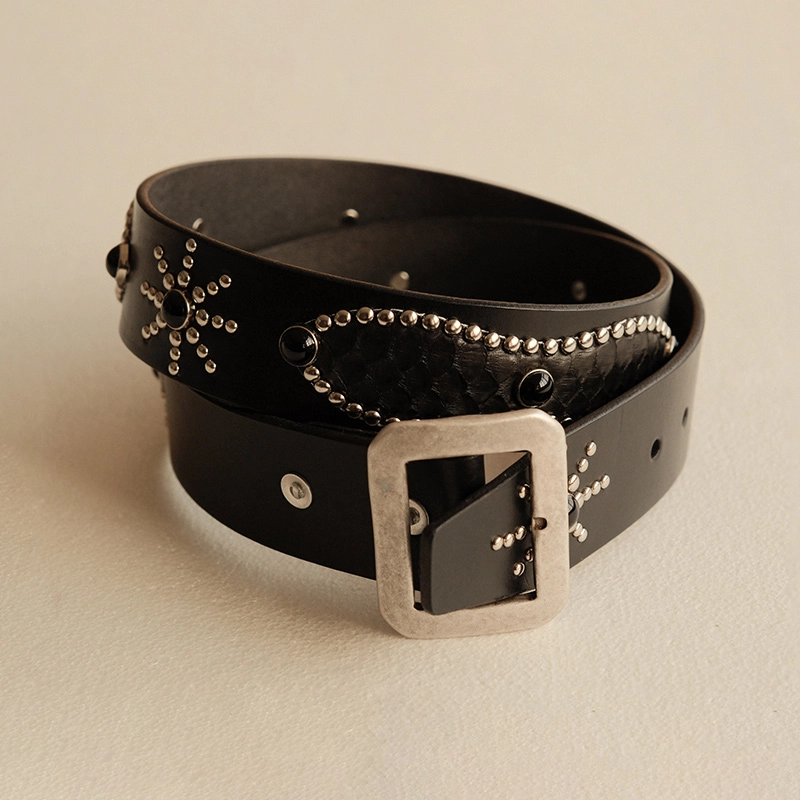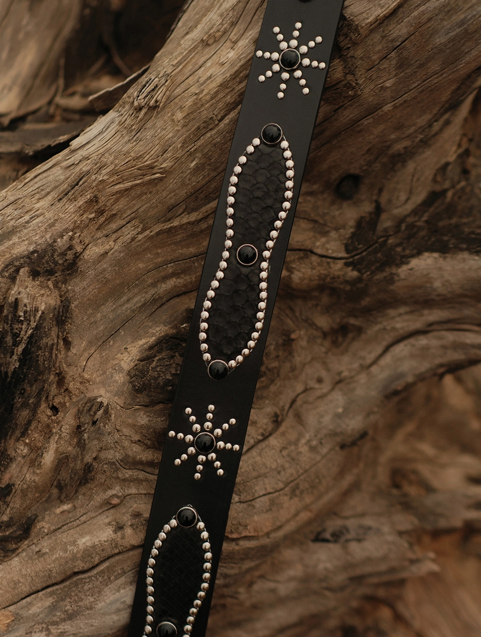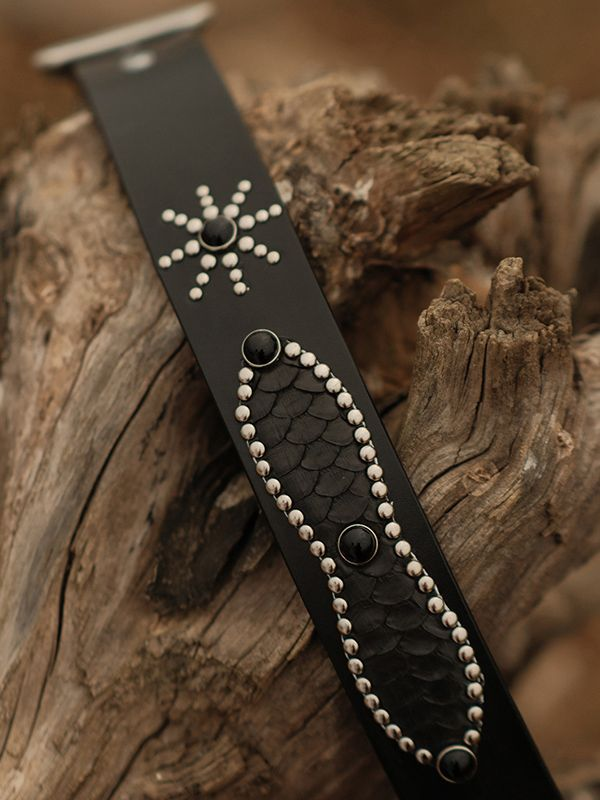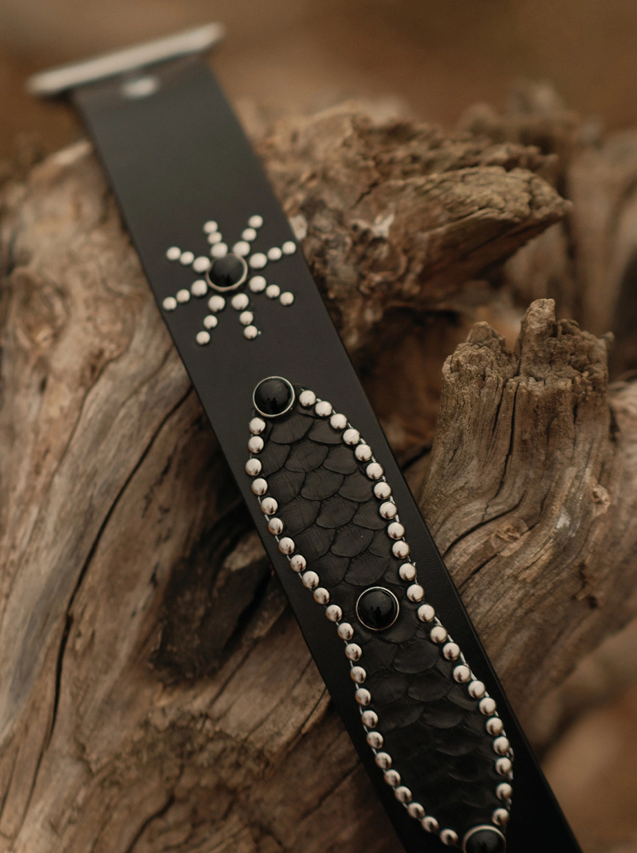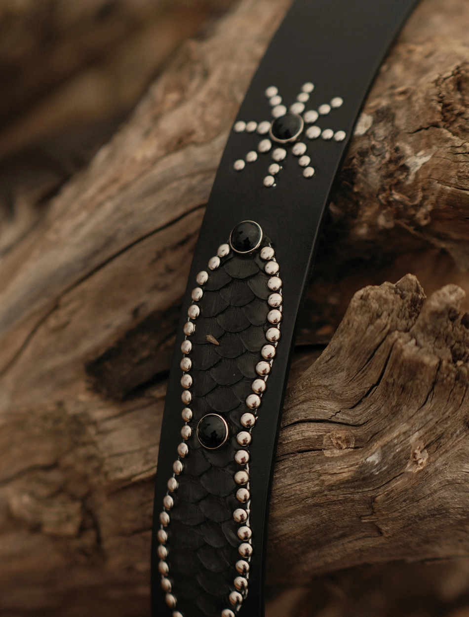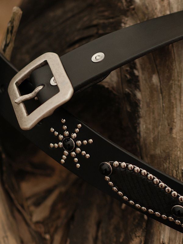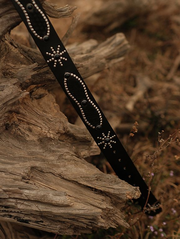 • 스네이크 가죽과 스터드 디테일이 돋보이는 웨스턴 무드 벨트입니다.
