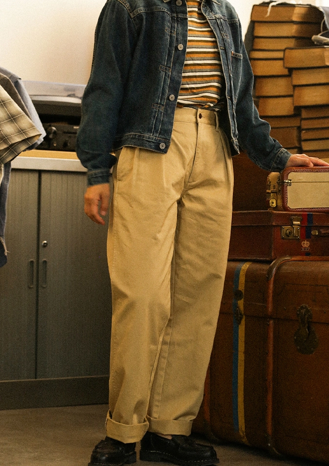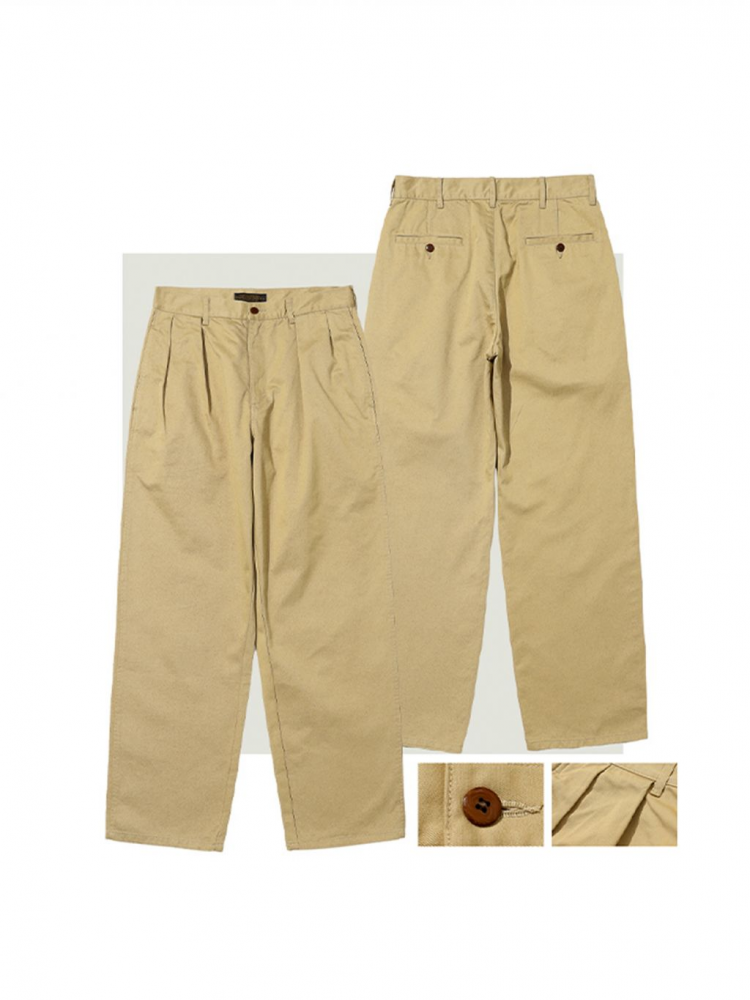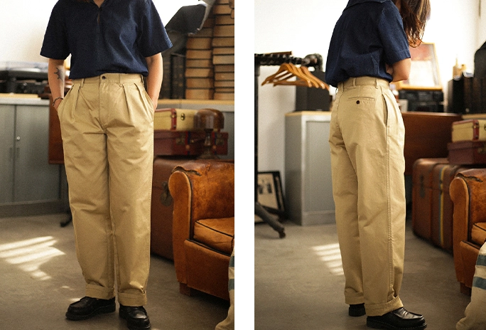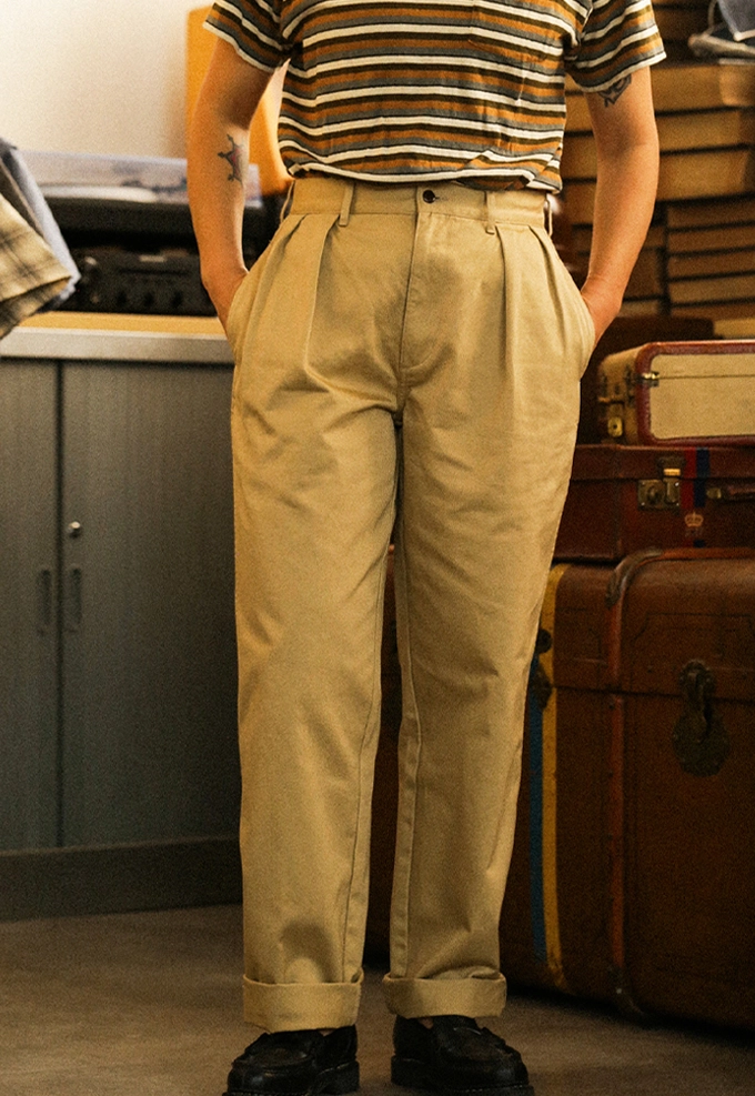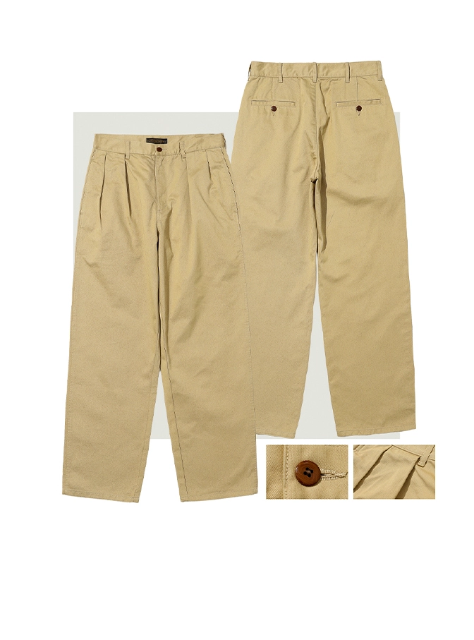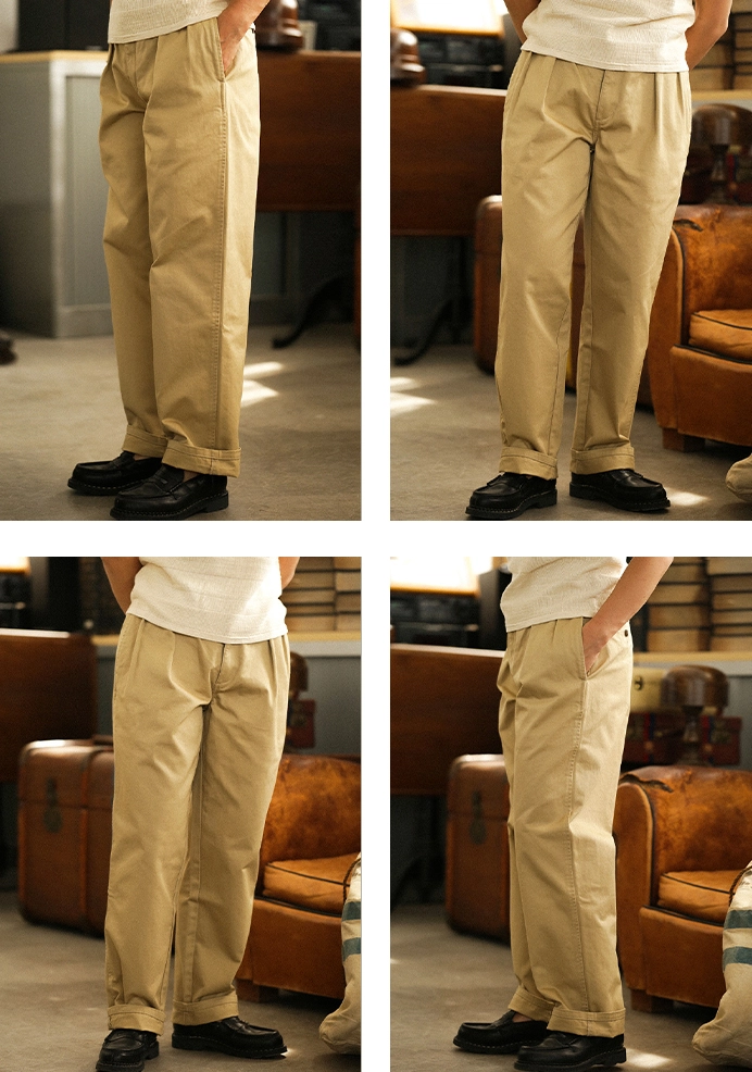 • 클래식 아이비리그 스타일에서 영감을 받은 스탠다드 치노 팬츠로, 여유 있는 실루엣과 프런트 턱 디테일이 특징입니다. 자연스럽게 떨어지는 스트레이트 핏으로 편안한 착용감을 선사하며, 데일리 팬츠로 손색없습니다.