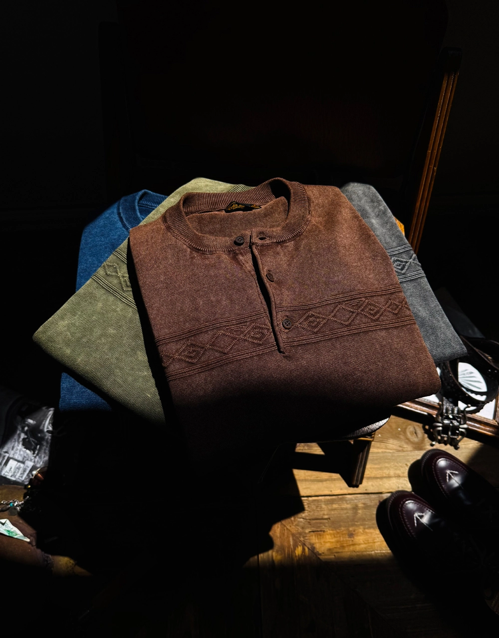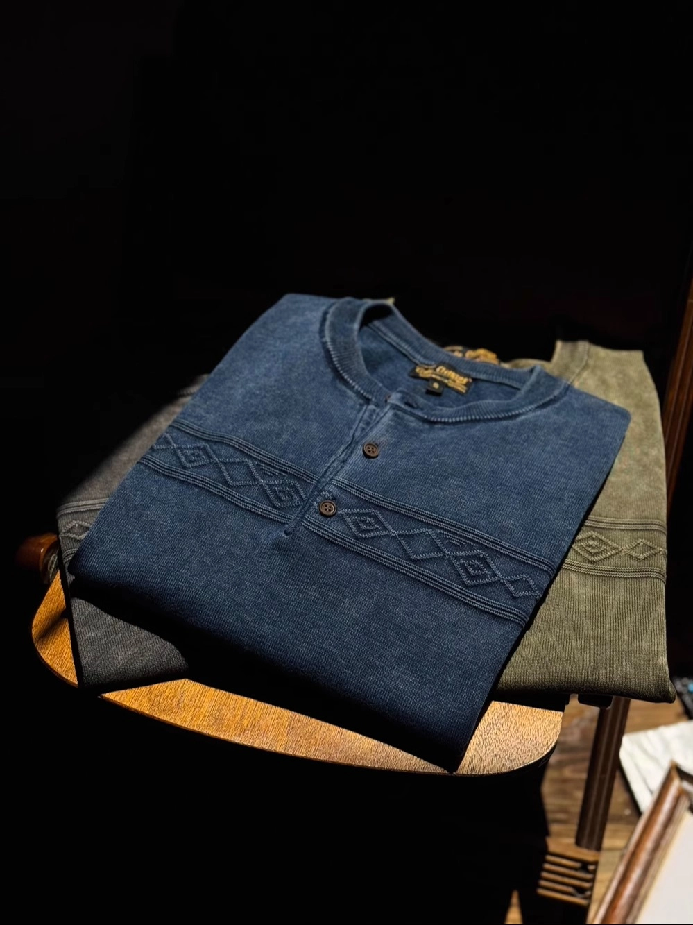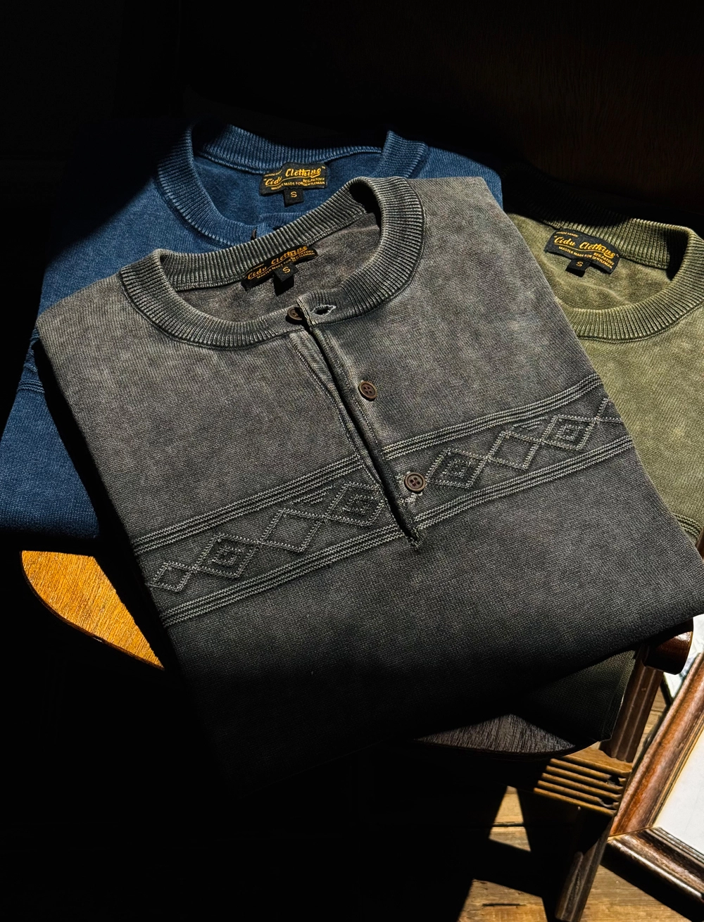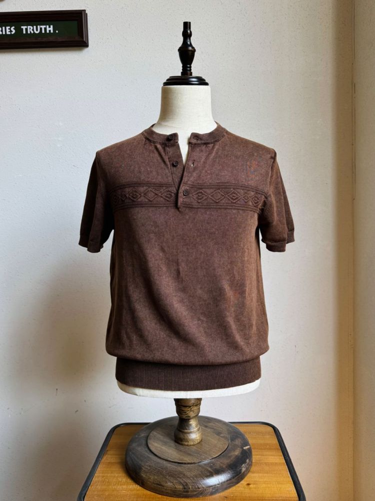 • 나바호 패턴과 스톤 워싱 텍스처가 조화를 이룬 빈티지 헨리넥 티셔츠입니다. 두 번의 염색과 세탁 과정을 거쳐 완성된 자연스러운 색감과 견고한 봉제 마감이 돋보이며, 단독 착용만으로도 스타일에 힘을 실어주는 아이템입니다.