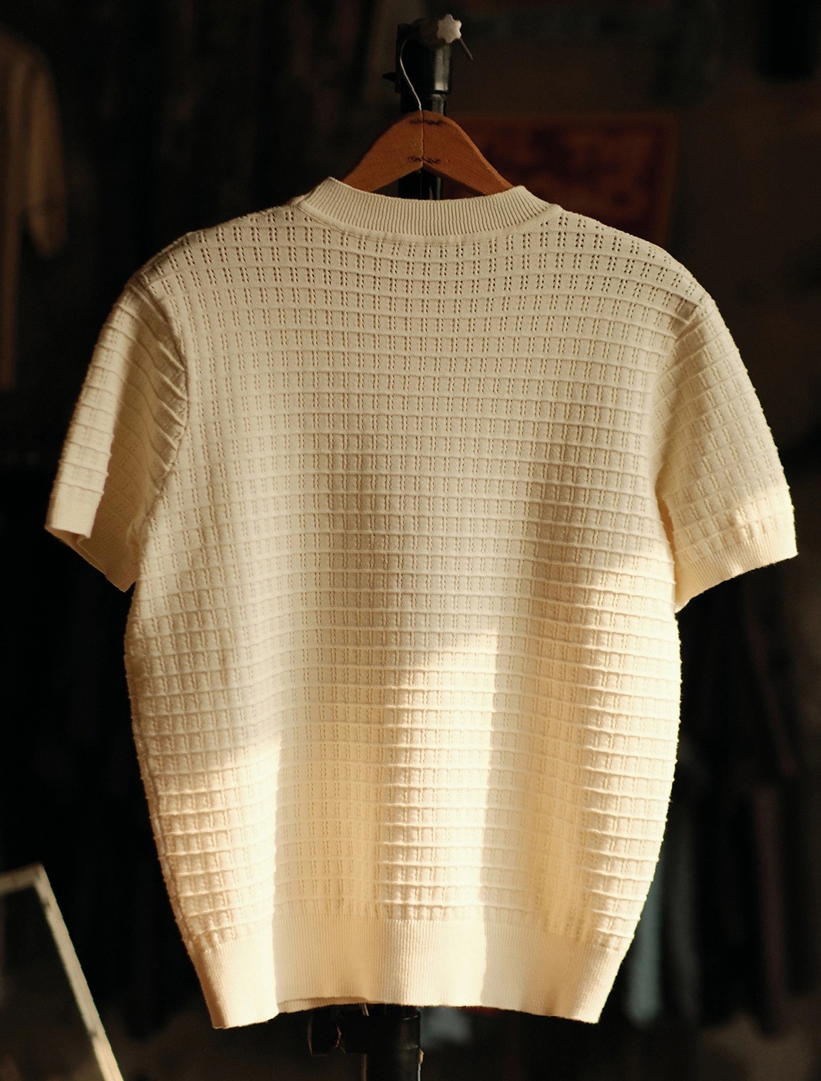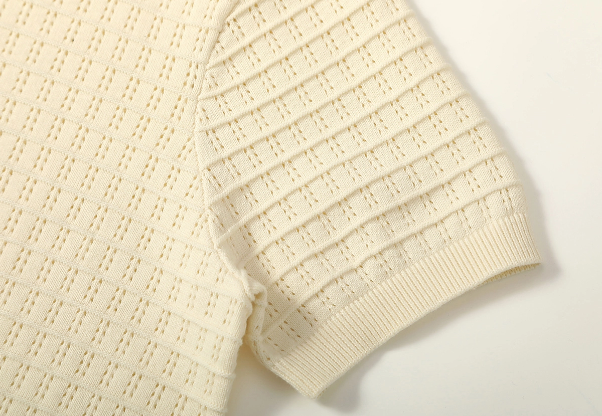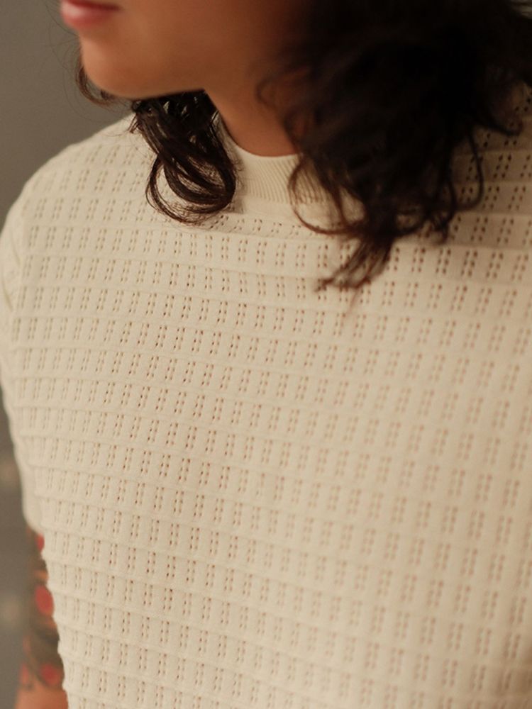 은은한 큐빅 디테일과 섬세한 펀칭 조직이 돋보이는 썸머 니트입니다.