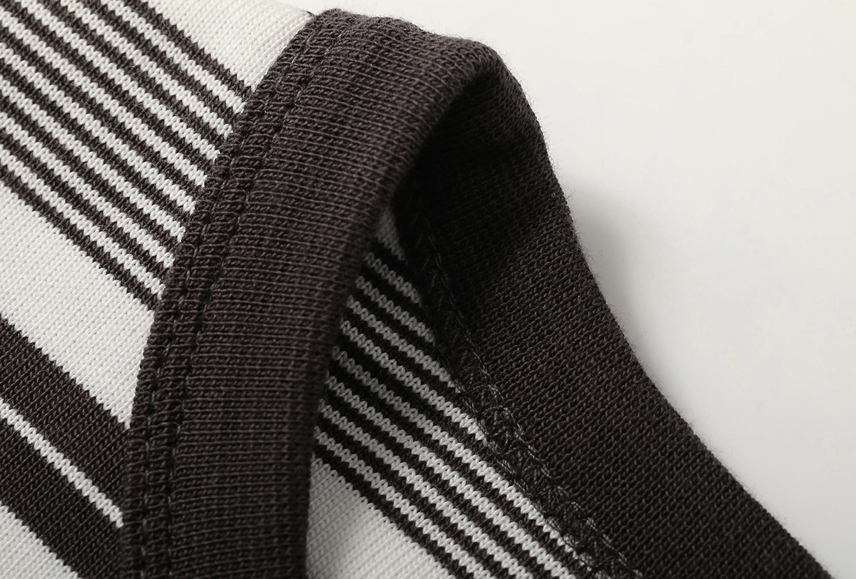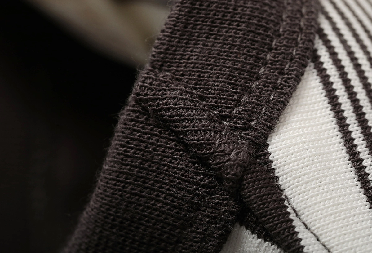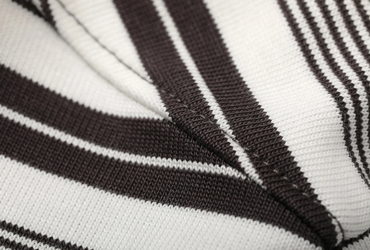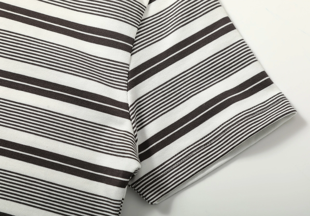 전면과 후면에 고르게 배치된 클래식 스트라이프 패턴과 배색 브이넥 리브 디테일이 조화를 이루며, 빈티지하면서도 스포티한 무드를 연출합니다.