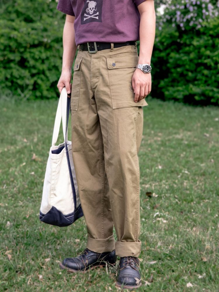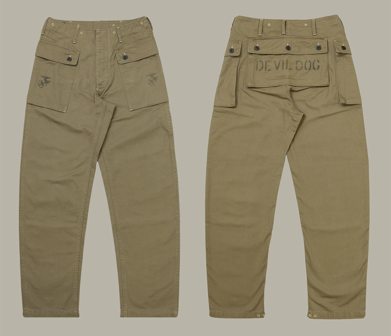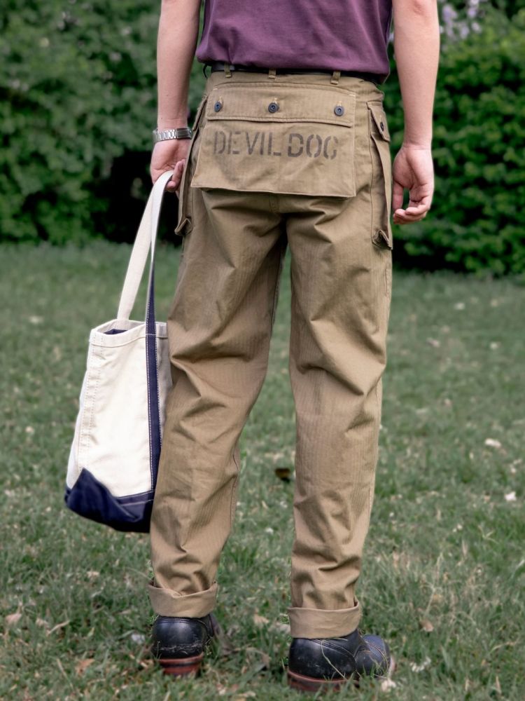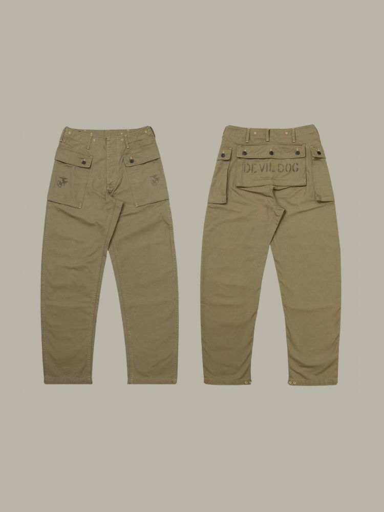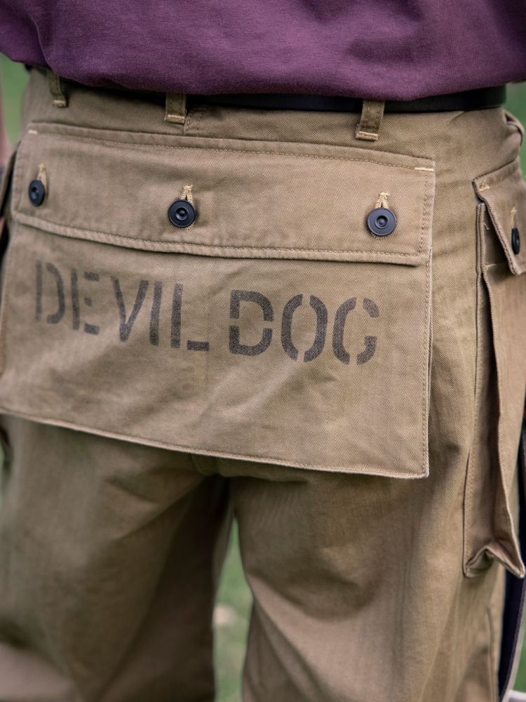 • 전통과 기능미가 공존하는 밀리터리 헤리티지를 담은 카고 팬츠로, 미 해병대 유니폼 ‘P-44’ 스타일을 현대적으로 재해석했습니다. 묵직한 헤링본 코튼 원단 위에 빈티지 프린팅과 버튼 디테일이 더해져 실용적인 데일리웨어로 완성되었으며, 후면 포켓의 “DEVIL DOG” 스텐실 프린트가 강렬한 존재감을 선사합니다.