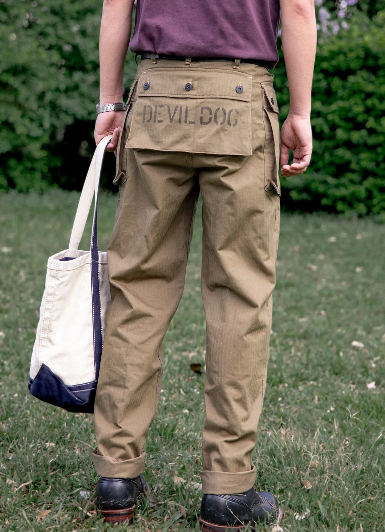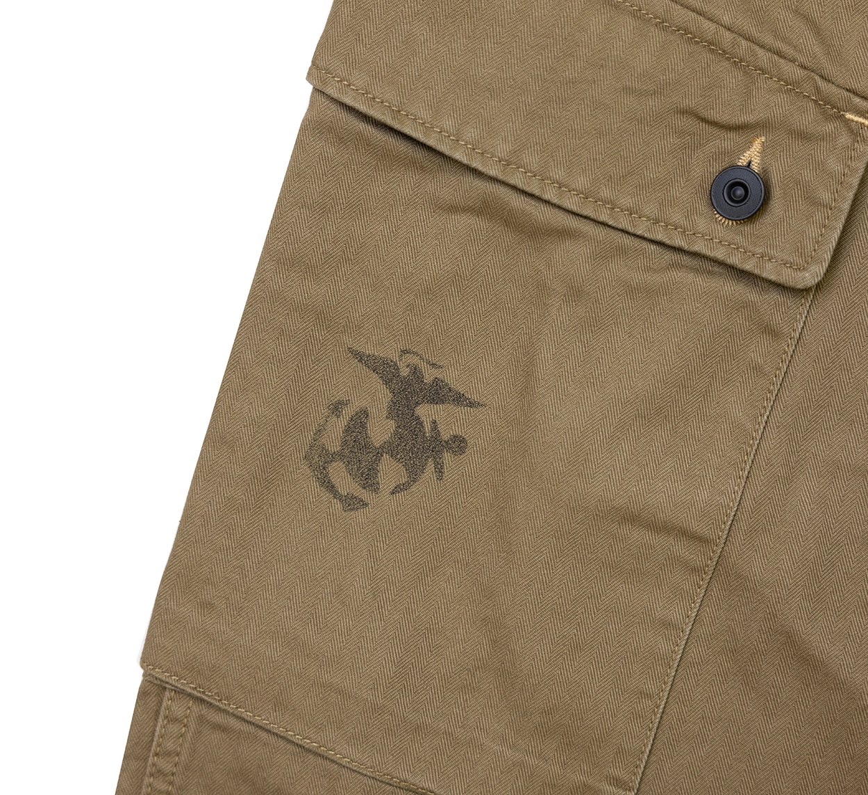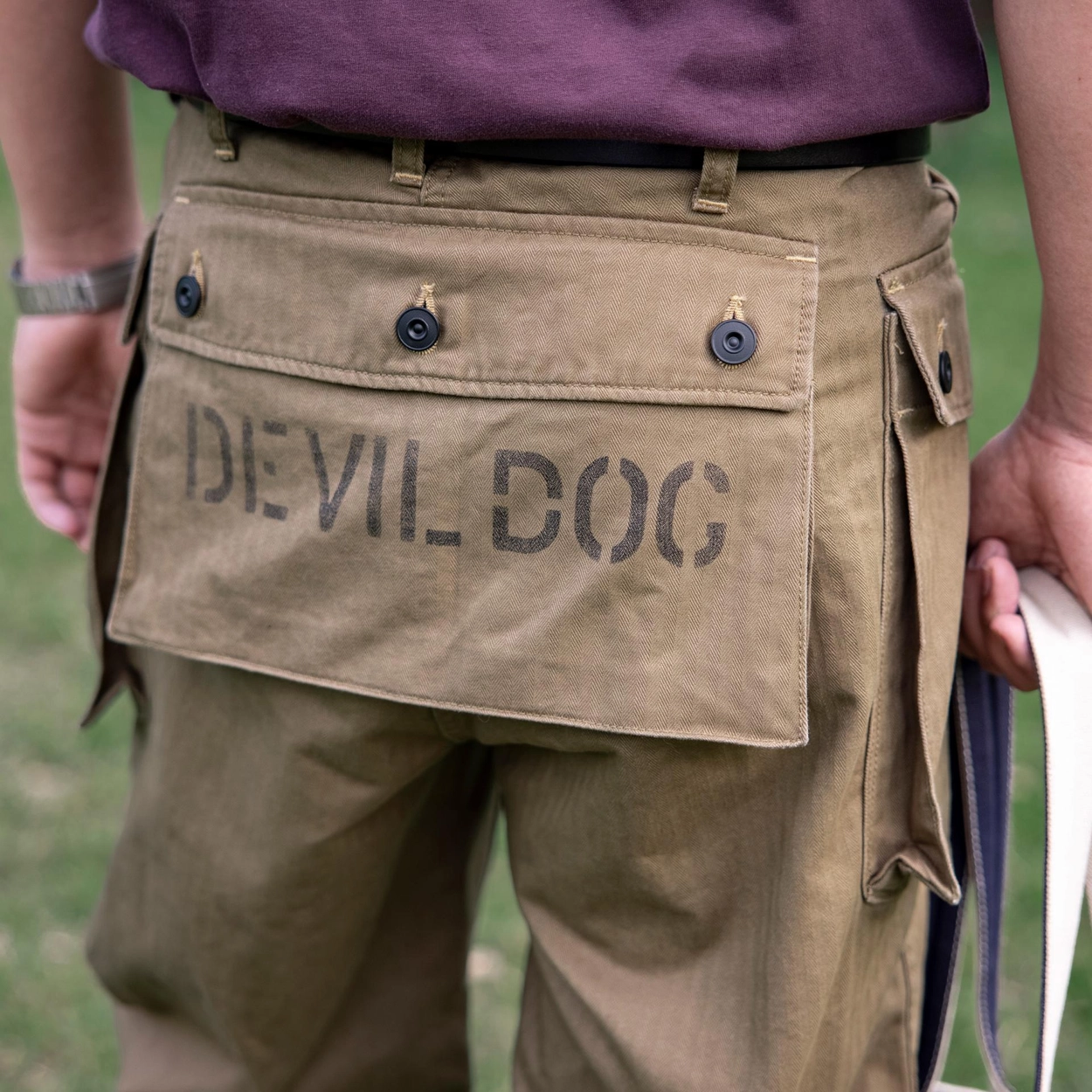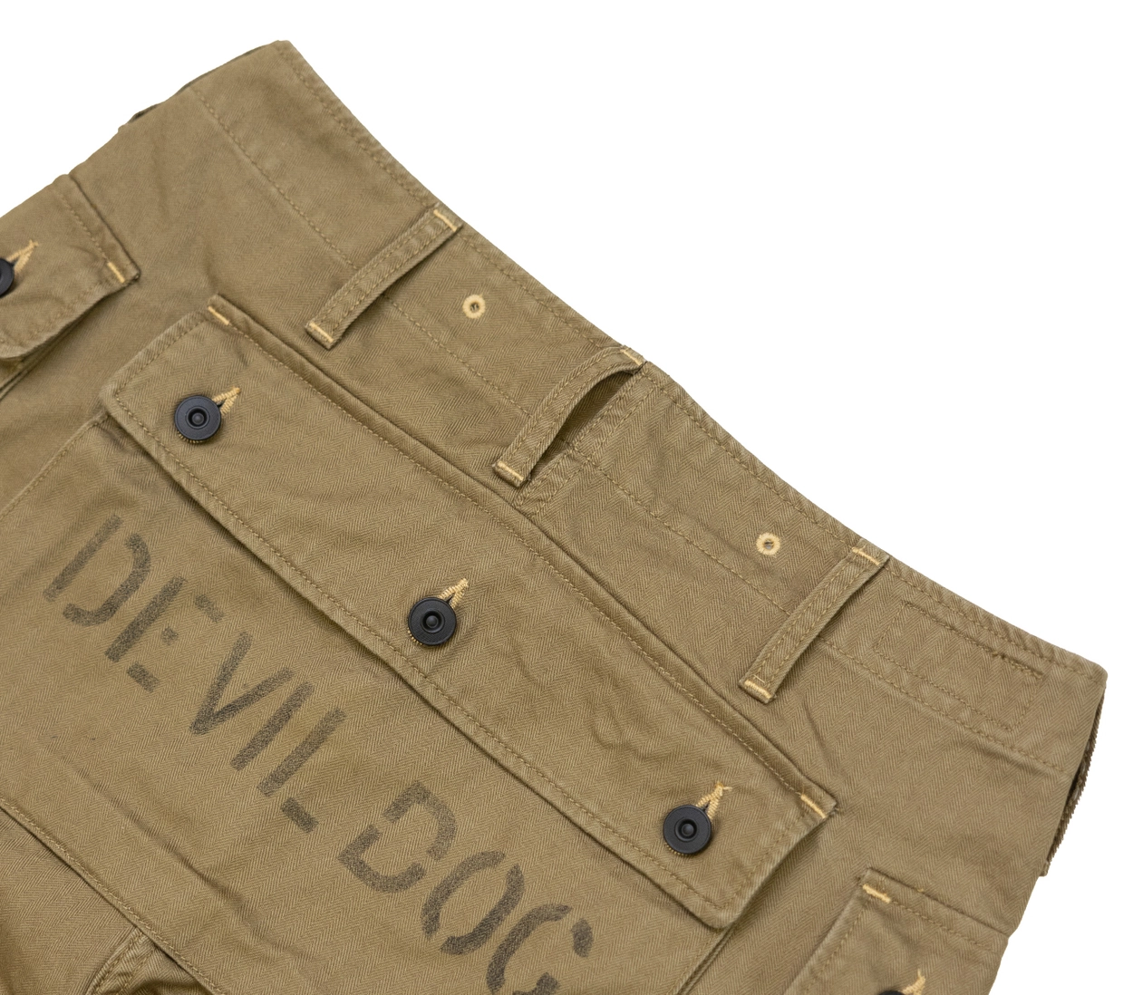 • 전통과 기능미가 공존하는 밀리터리 헤리티지를 담은 카고 팬츠로, 미 해병대 유니폼 ‘P-44’ 스타일을 현대적으로 재해석했습니다. 묵직한 헤링본 코튼 원단 위에 빈티지 프린팅과 버튼 디테일이 더해져 실용적인 데일리웨어로 완성되었으며, 후면 포켓의 “DEVIL DOG” 스텐실 프린트가 강렬한 존재감을 선사합니다.