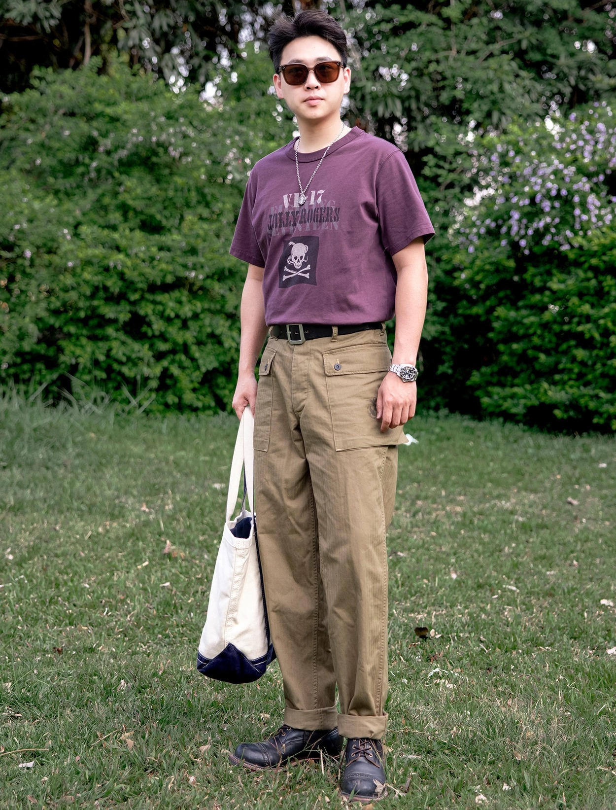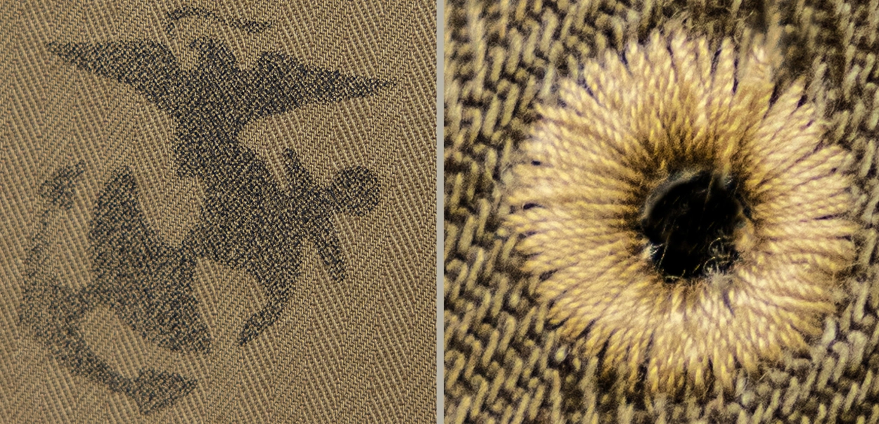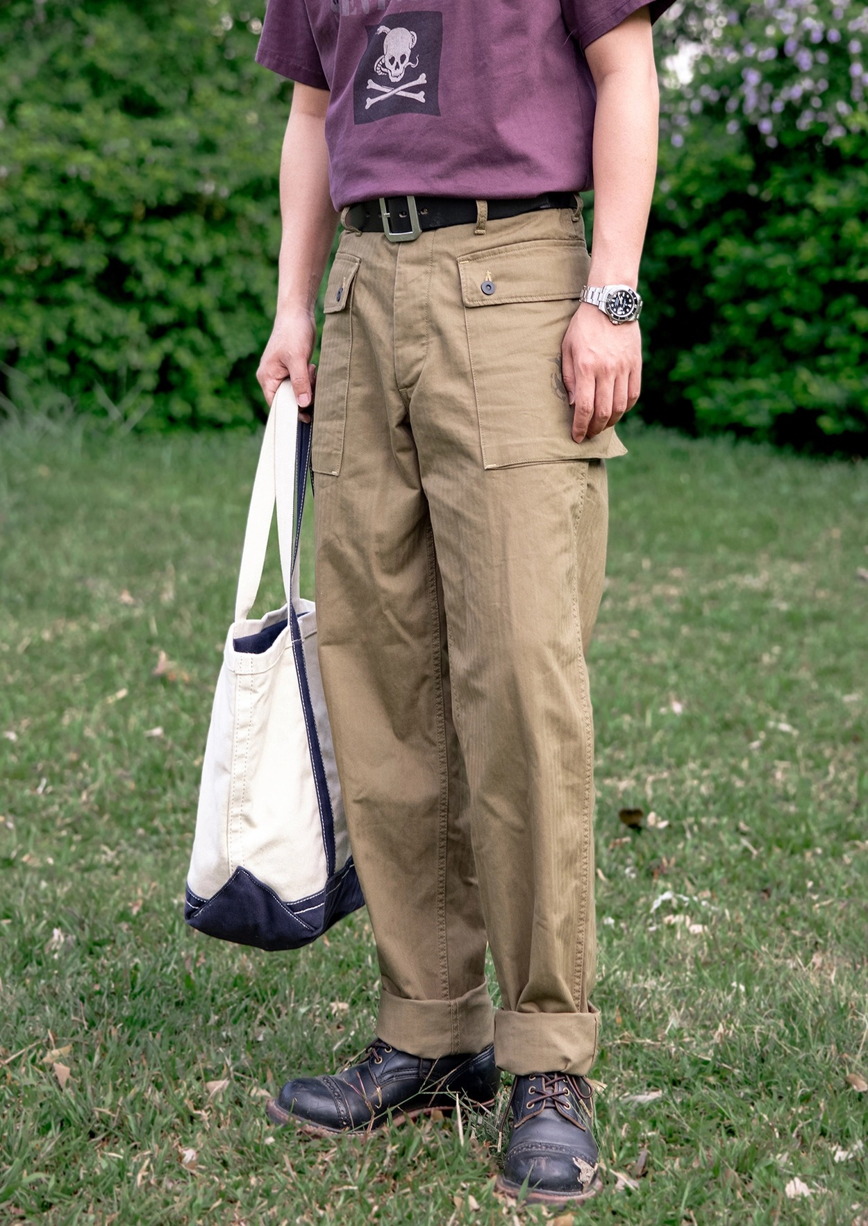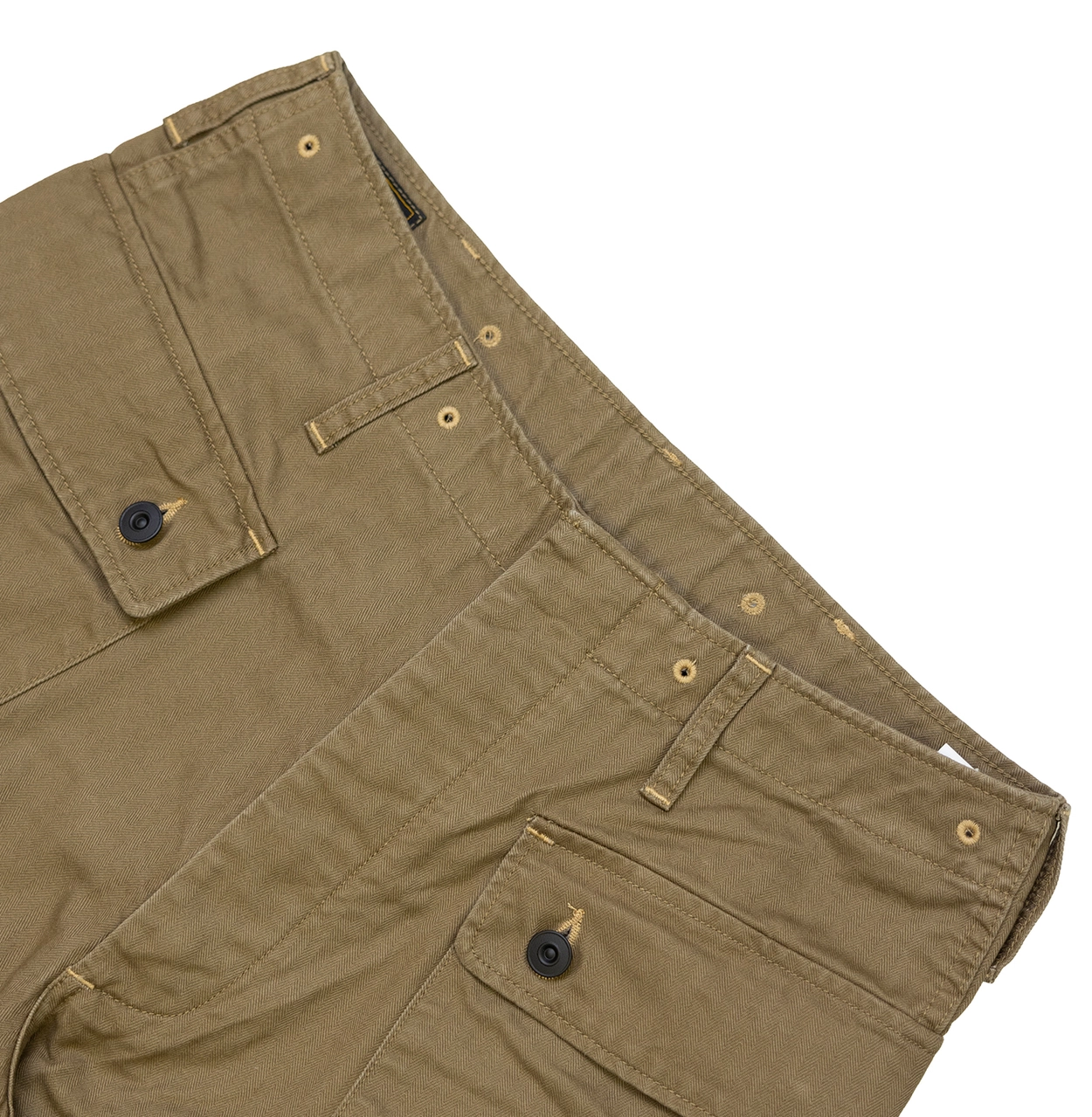 • 전통과 기능미가 공존하는 밀리터리 헤리티지를 담은 카고 팬츠로, 미 해병대 유니폼 ‘P-44’ 스타일을 현대적으로 재해석했습니다. 묵직한 헤링본 코튼 원단 위에 빈티지 프린팅과 버튼 디테일이 더해져 실용적인 데일리웨어로 완성되었으며, 후면 포켓의 “DEVIL DOG” 스텐실 프린트가 강렬한 존재감을 선사합니다.