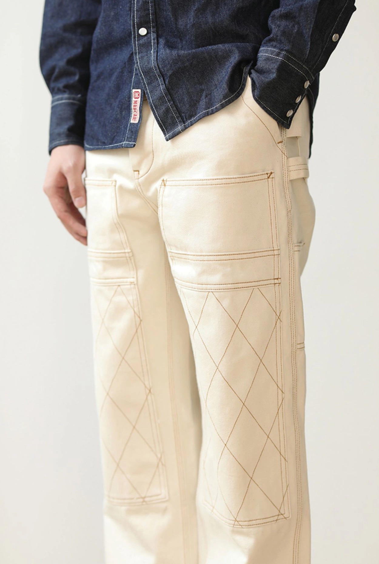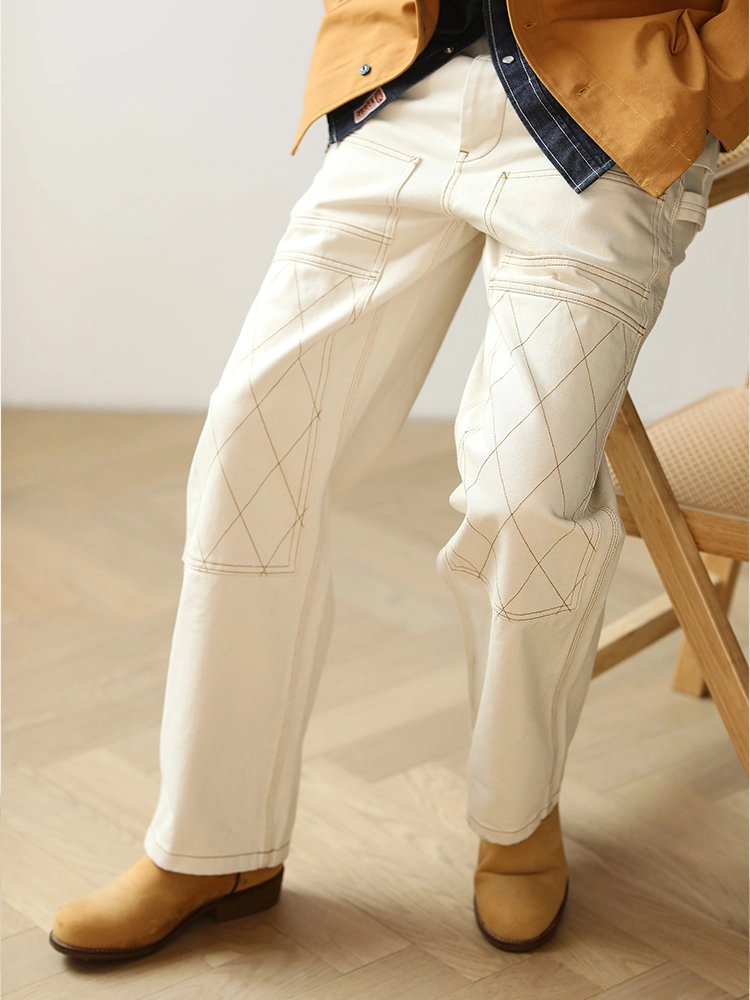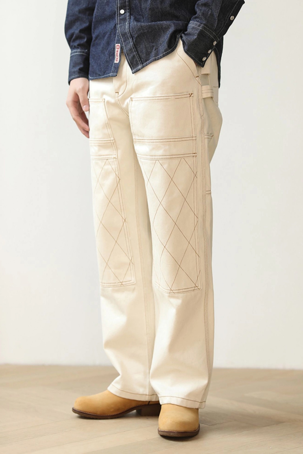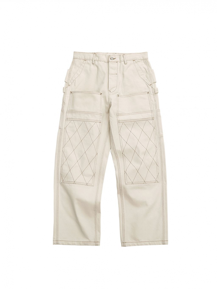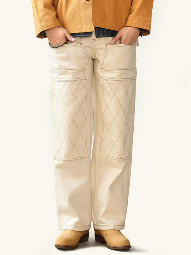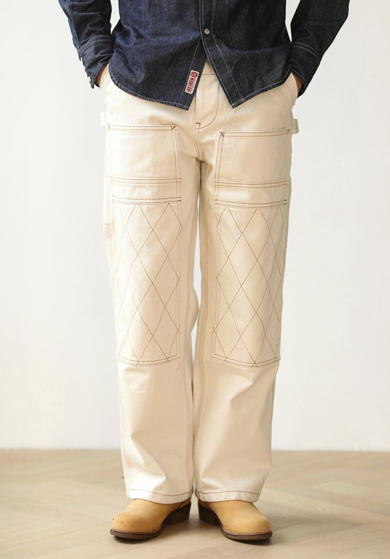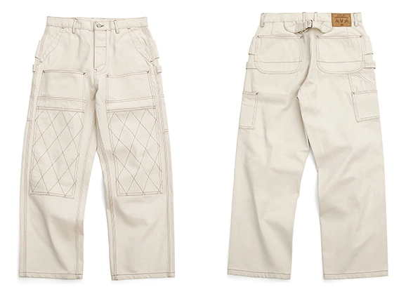 워크웨어의 상징인 ‘더블 니 패치’ 디테일을 중심으로 완성된 화이트 데님 팬츠입니다. 15oz 헤비웨이트 데님에 더블니 퀼팅 스티치로 내구성을 더했으며, 햄머 루프와 툴포켓으로 실용적인 무드를 강화했습니다. 허리 뒷면의 다트와 V요크 디테일은 인체 곡선을 반영해 안정적인 착용감을 제공하고, 오토바이 감성과 아메카지 무드를 함께 담은 클래식 캐주얼 팬츠입니다.