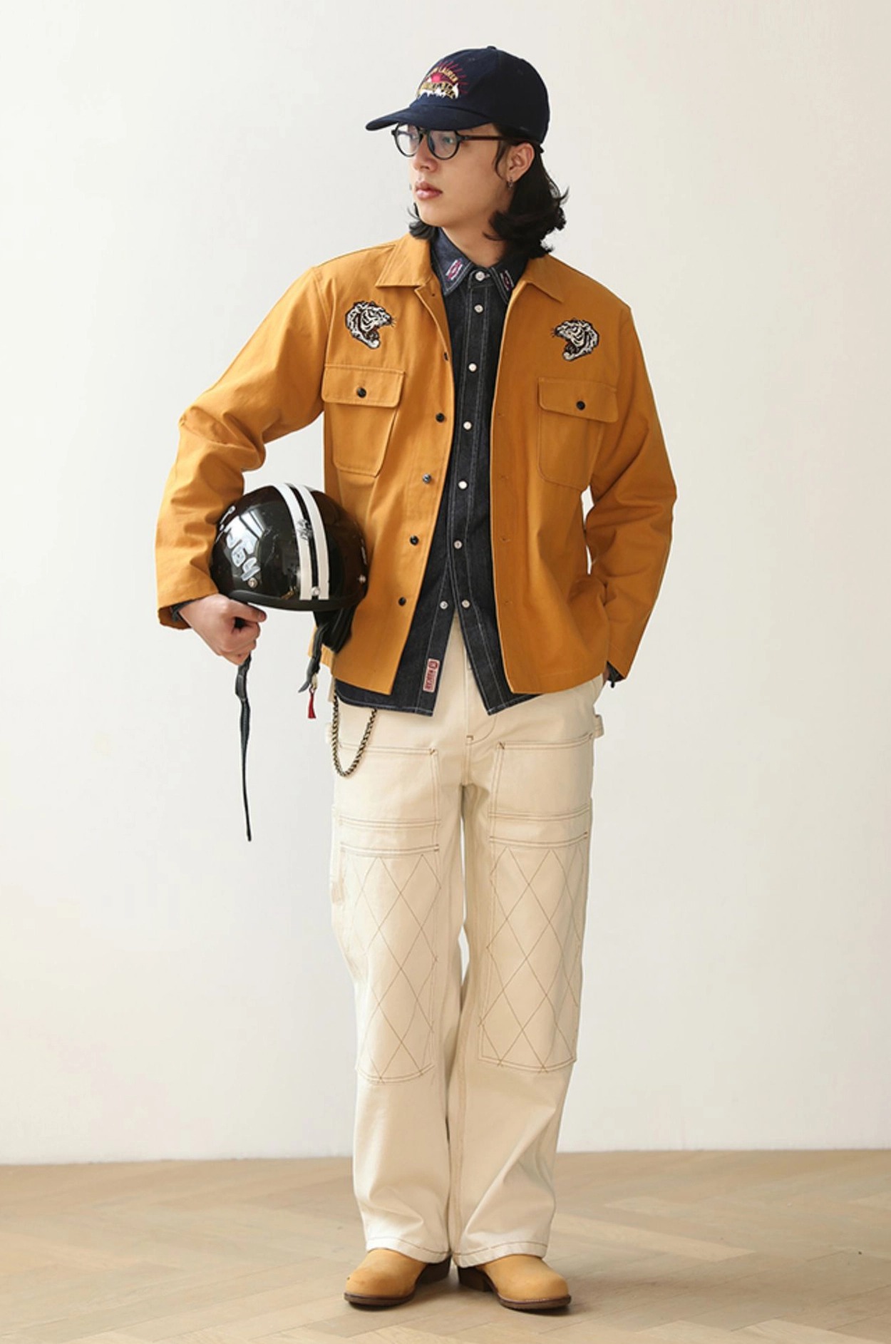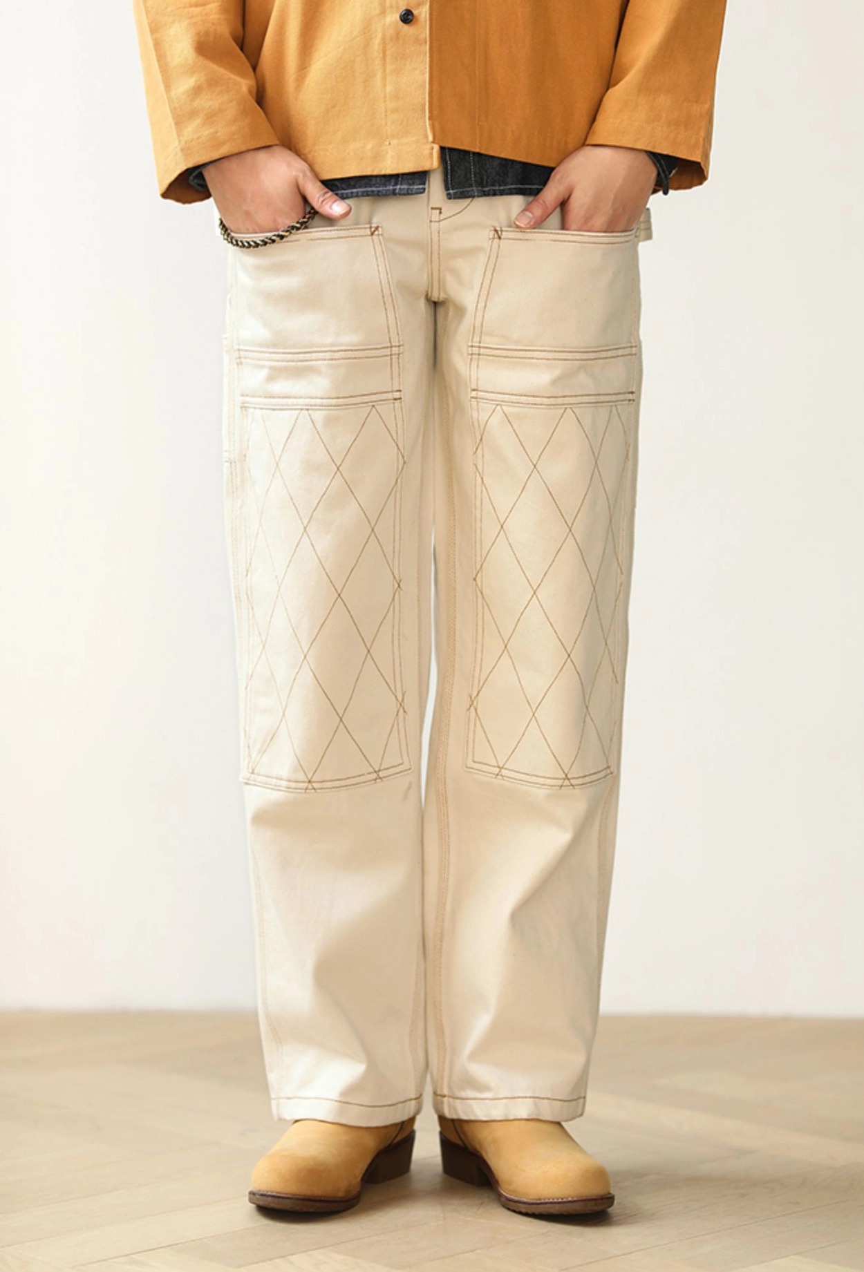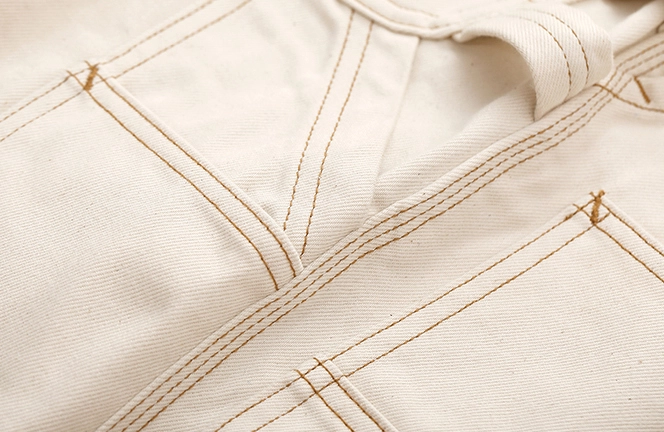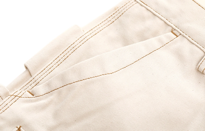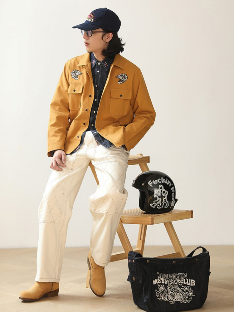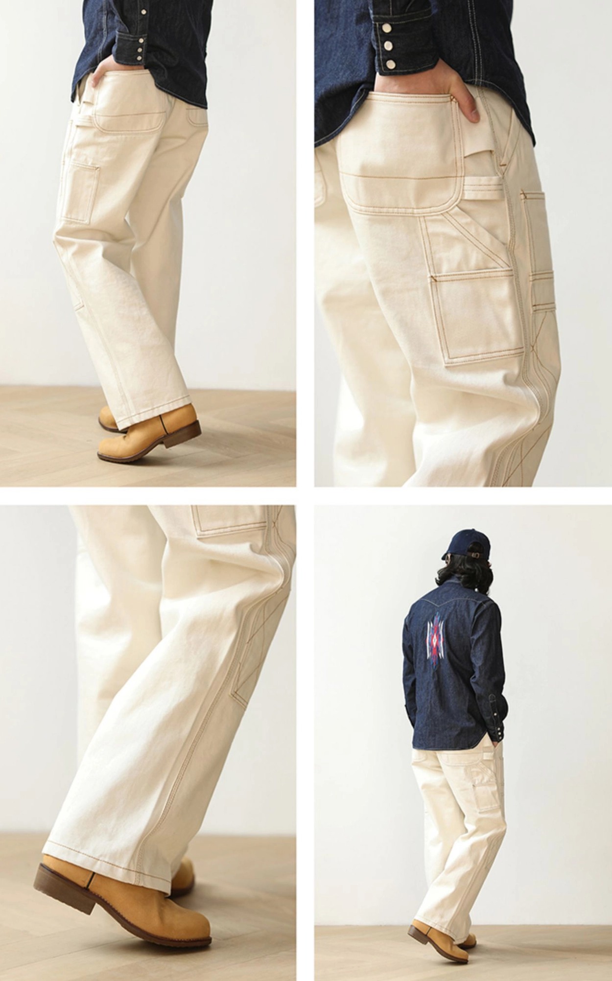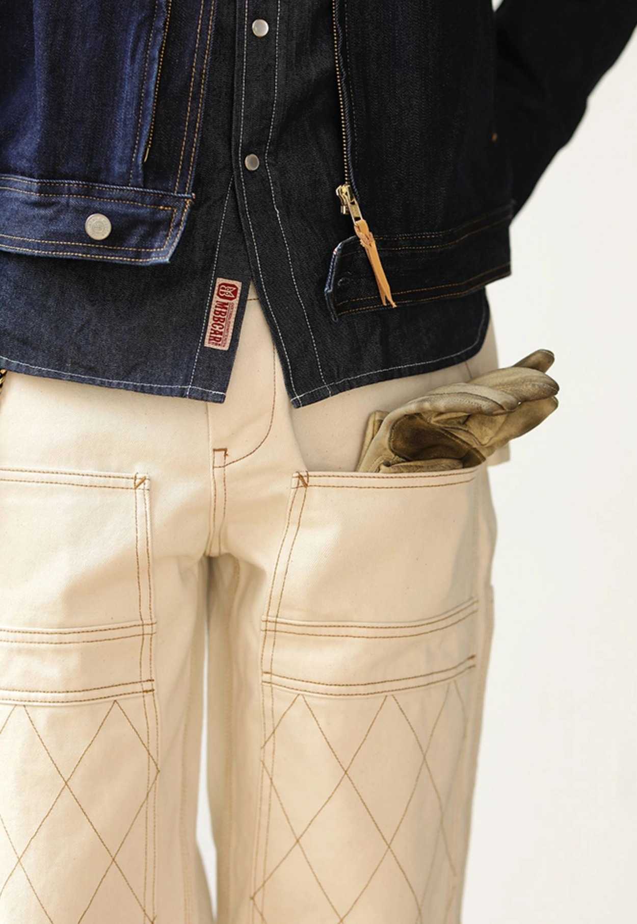 워크웨어의 상징인 ‘더블 니 패치’ 디테일을 중심으로 완성된 화이트 데님 팬츠입니다. 15oz 헤비웨이트 데님에 더블니 퀼팅 스티치로 내구성을 더했으며, 햄머 루프와 툴포켓으로 실용적인 무드를 강화했습니다. 허리 뒷면의 다트와 V요크 디테일은 인체 곡선을 반영해 안정적인 착용감을 제공하고, 오토바이 감성과 아메카지 무드를 함께 담은 클래식 캐주얼 팬츠입니다.