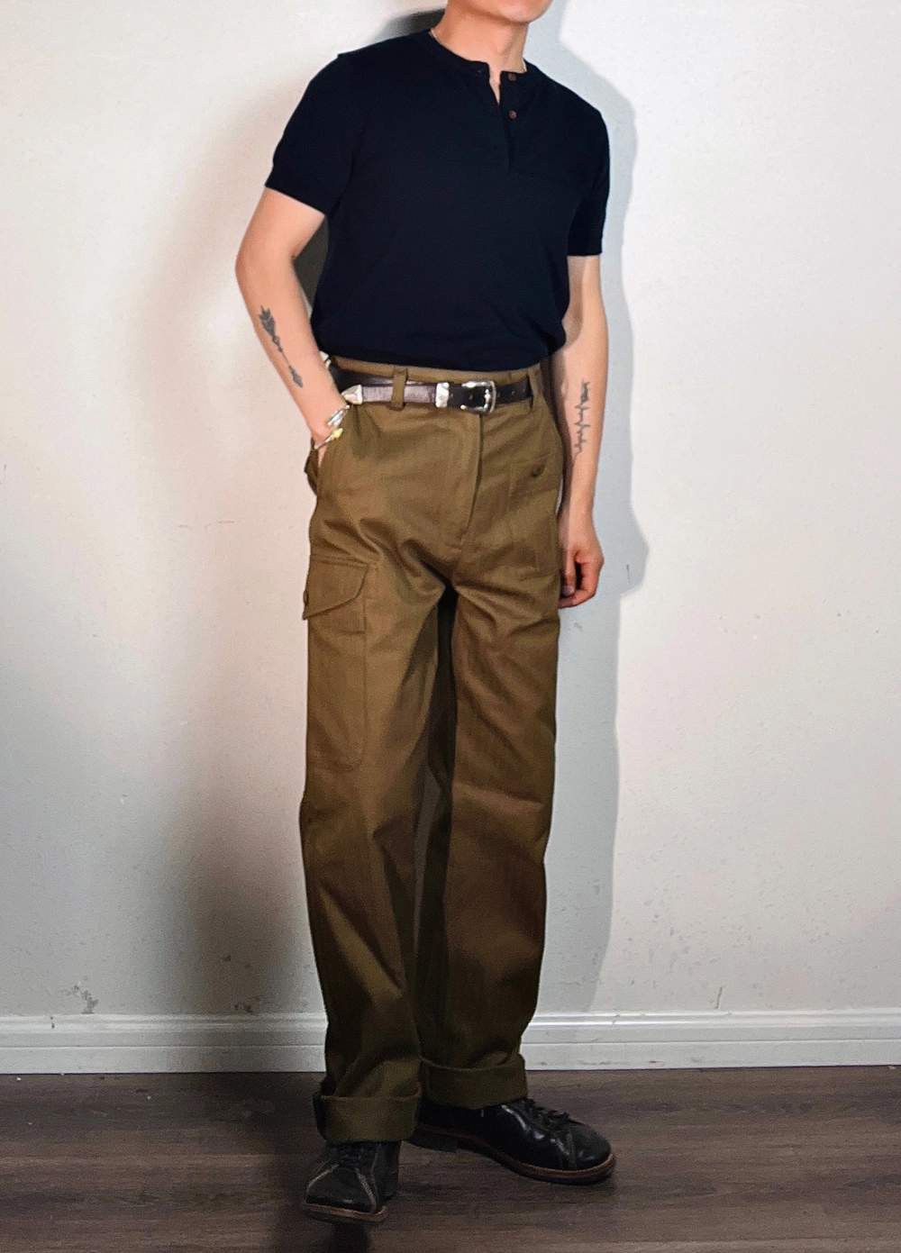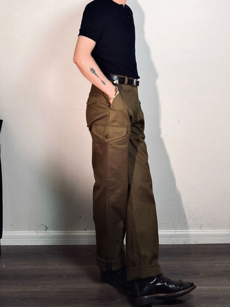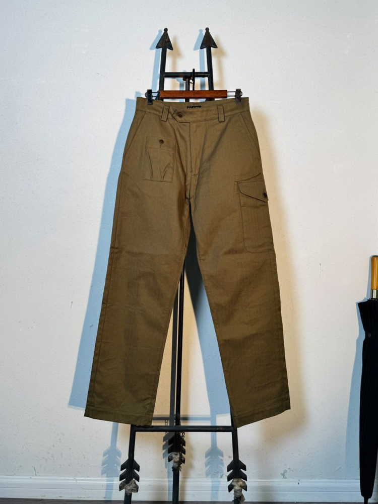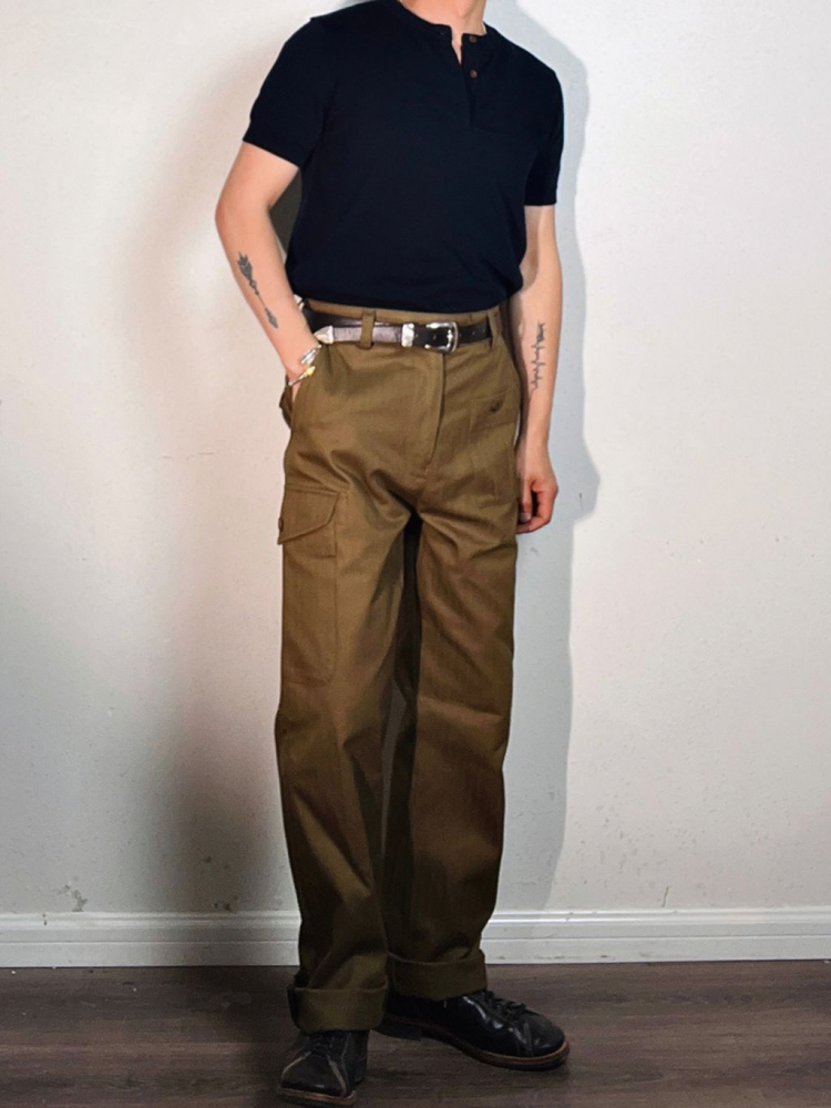 과도한 디테일 없이 실용성에 집중한 포켓 구성과 간결한 실루엣의 팬츠로, 정돈된 클래식 밀리터리 룩을 연출할 수 있는 아이템입니다. 더블 포켓 디자인과 무릎까지 이어지는 구조적 절개 라인이 돋보이며, 중간 높이의 웨이스트와 스트레이트 핏으로 누구에게나 안정감 있게 잘 어울립니다.