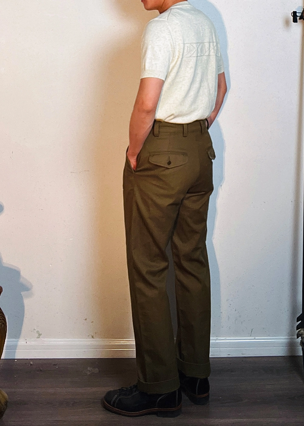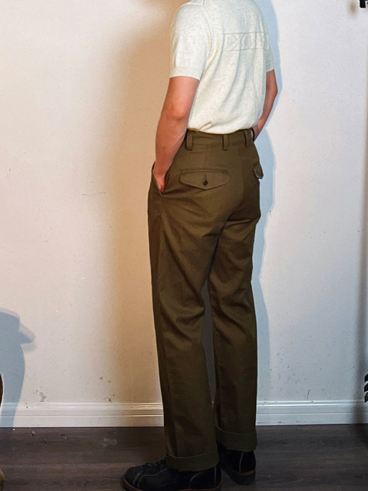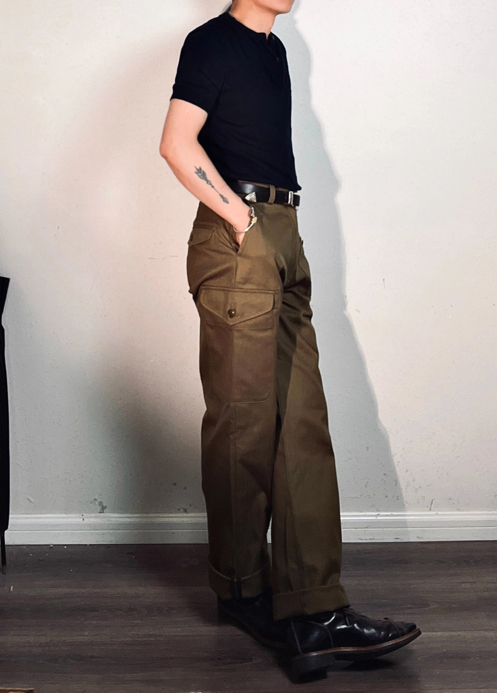 과도한 디테일 없이 실용성에 집중한 포켓 구성과 간결한 실루엣의 팬츠로, 정돈된 클래식 밀리터리 룩을 연출할 수 있는 아이템입니다. 더블 포켓 디자인과 무릎까지 이어지는 구조적 절개 라인이 돋보이며, 중간 높이의 웨이스트와 스트레이트 핏으로 누구에게나 안정감 있게 잘 어울립니다.