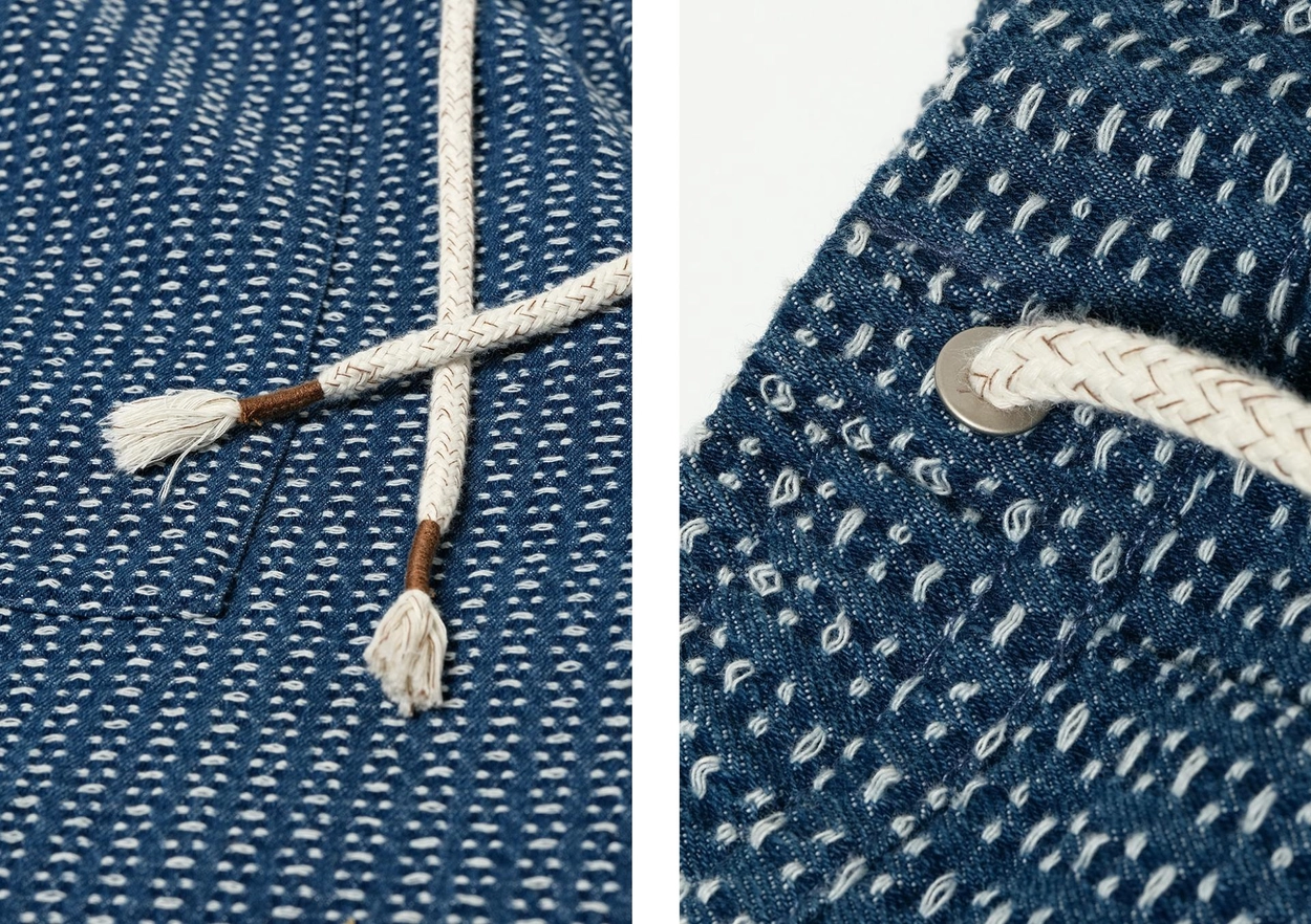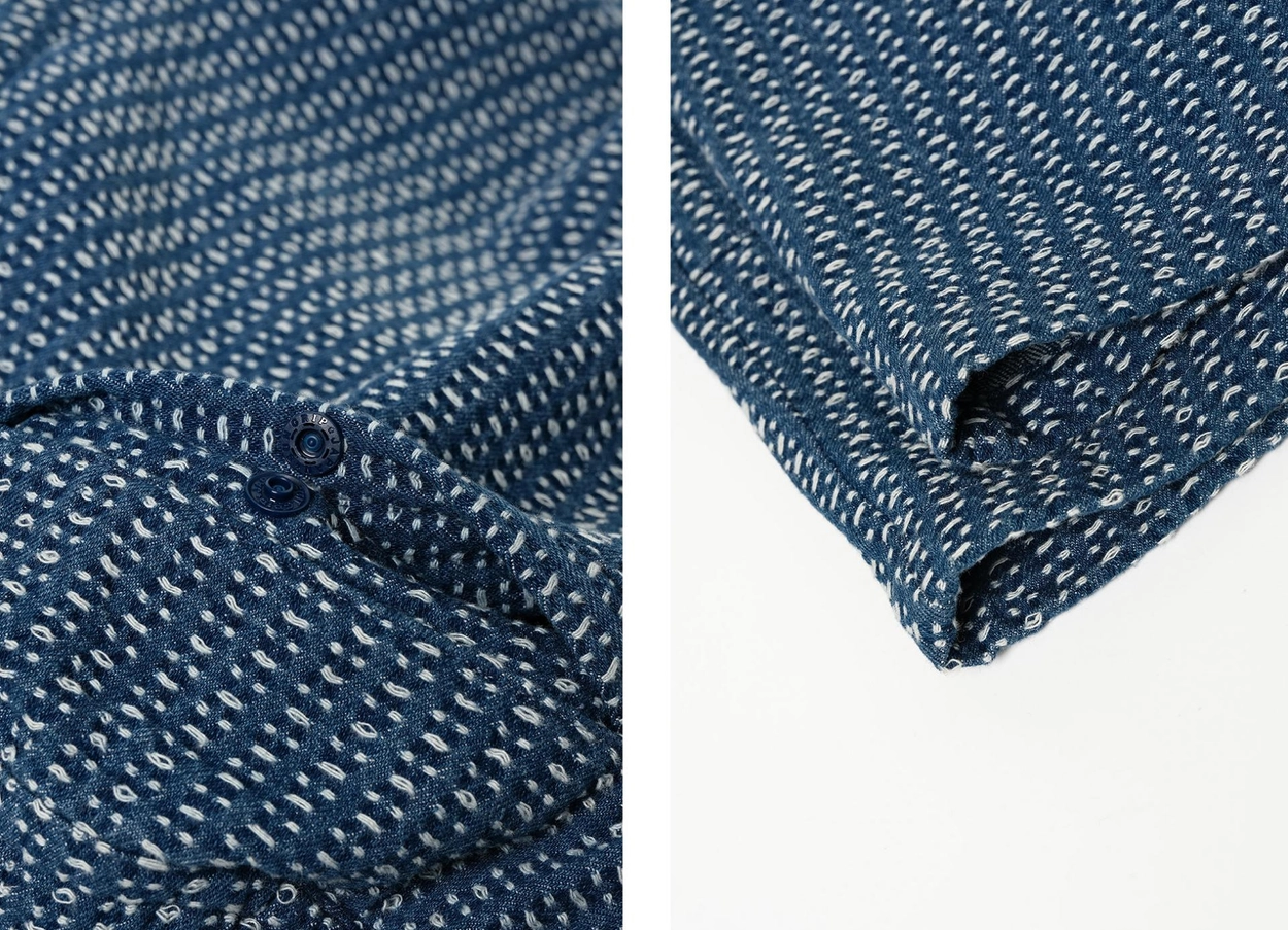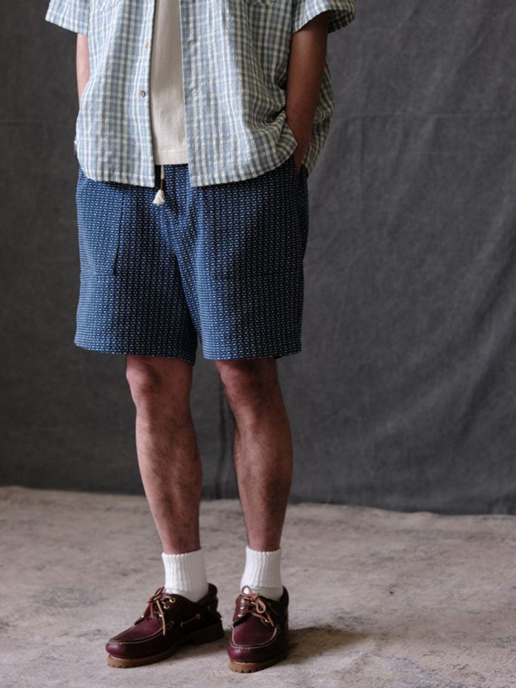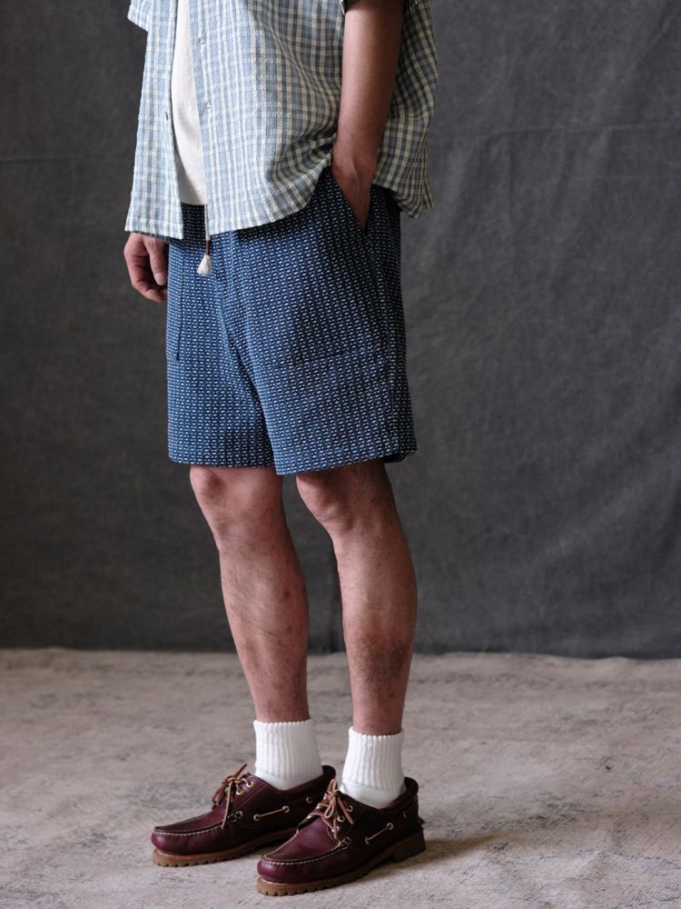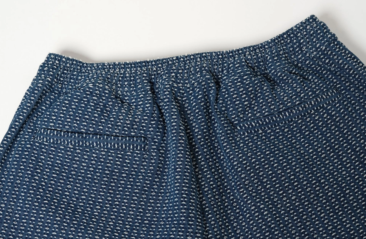 전통 사시코 자수에서 영감을 받은 자카드 인디고 데님 쇼츠입니다. 입체적인 텍스처와 빈티지한 컬러감이 어우러지며, 허리 밴딩과 조절 스트링으로 편안한 착용감을 제공합니다.