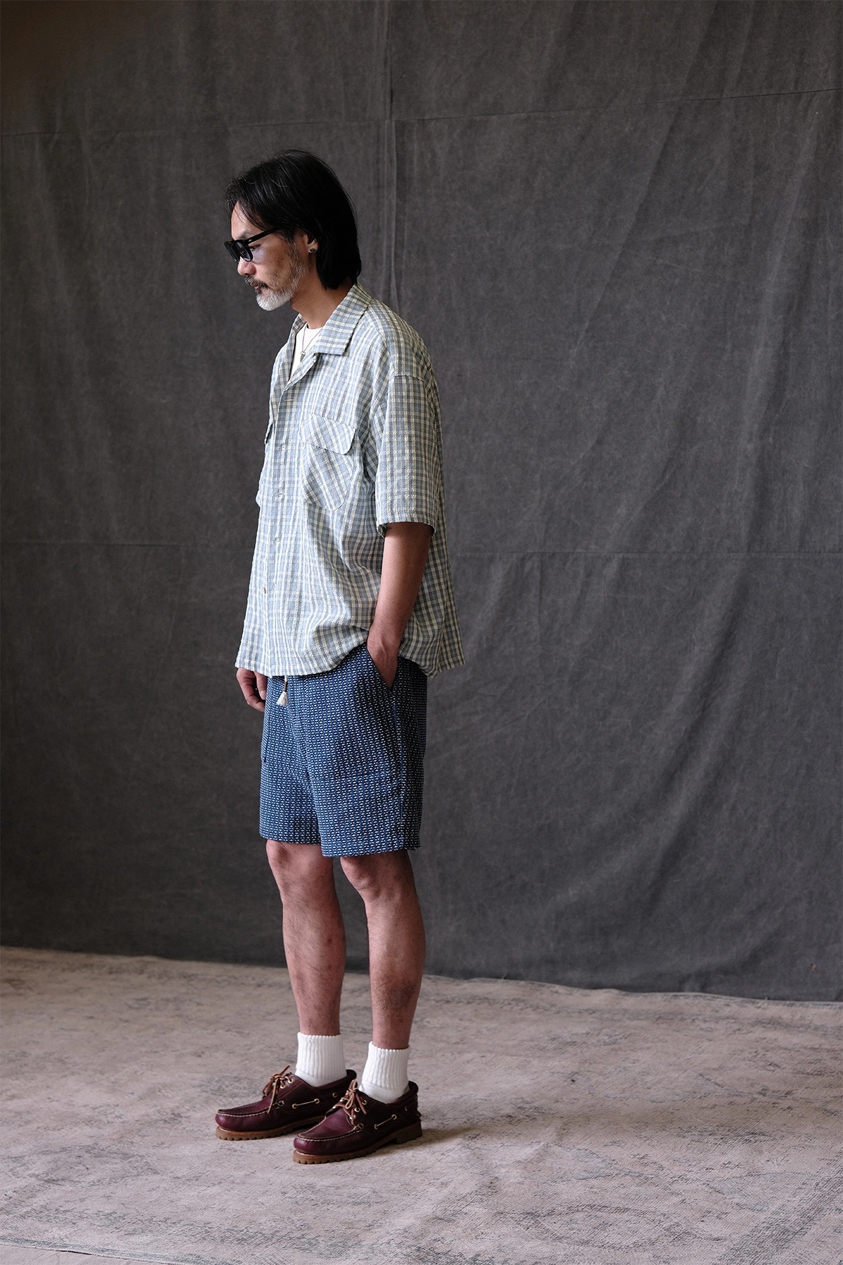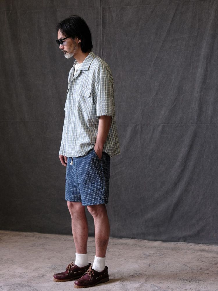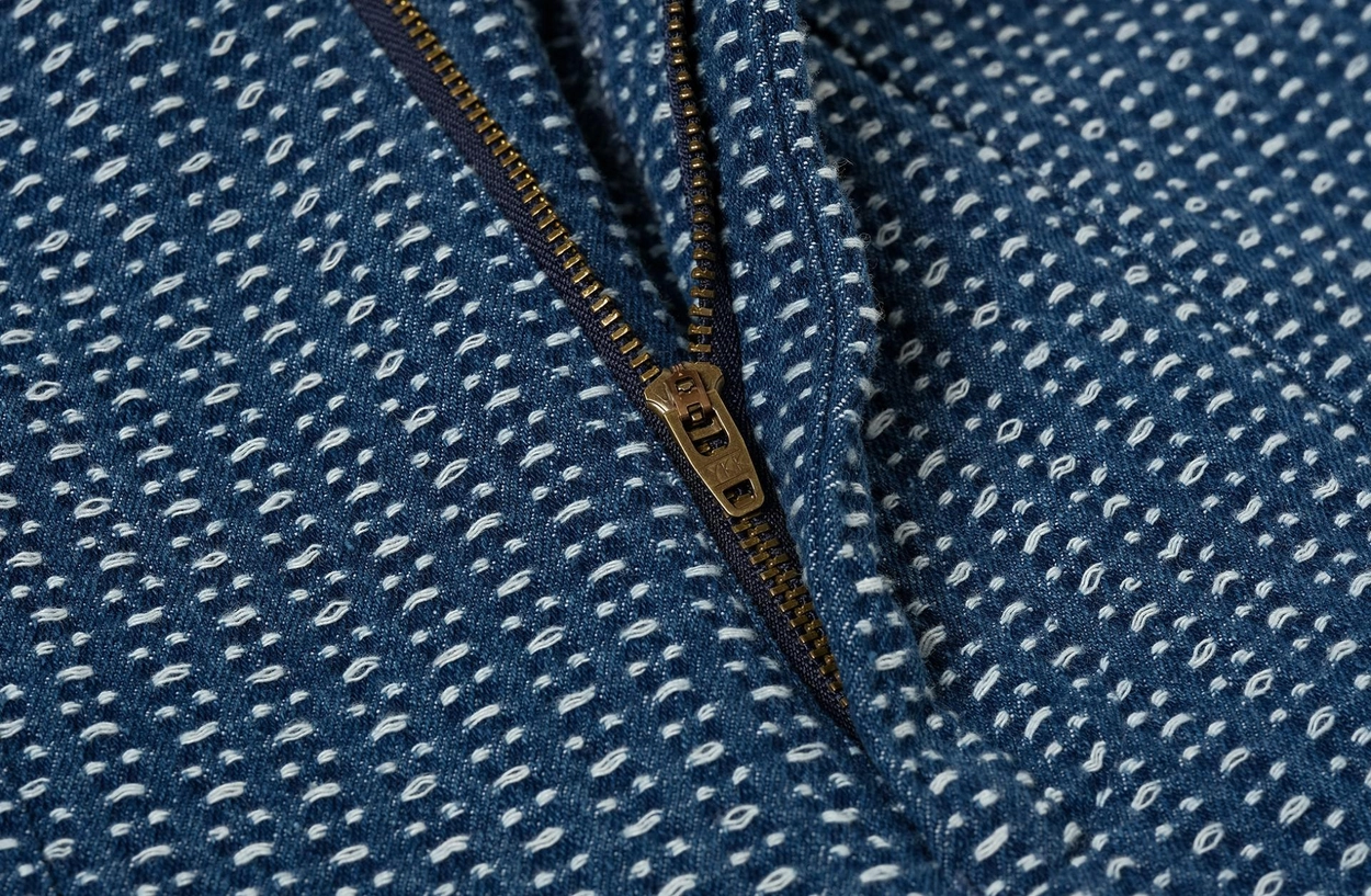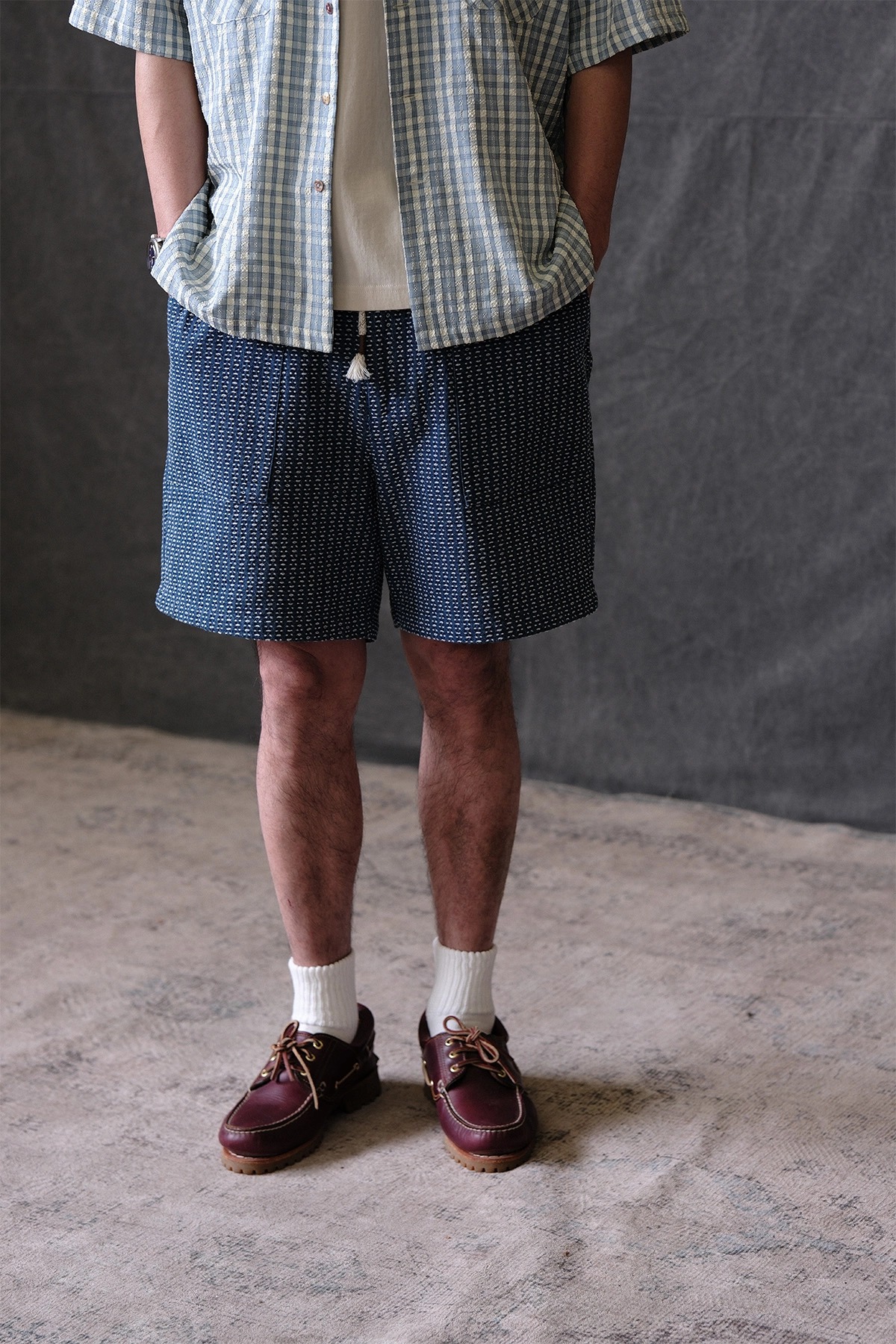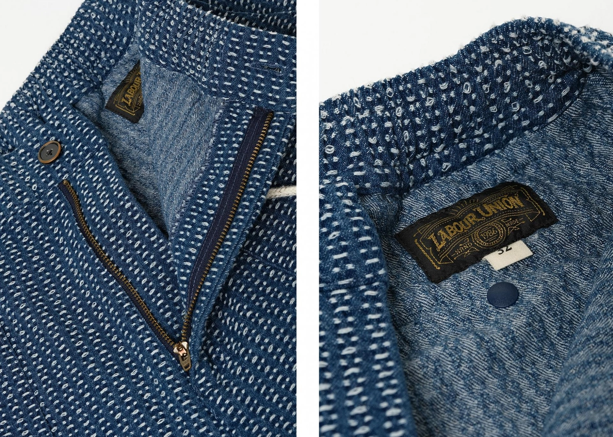 전통 사시코 자수에서 영감을 받은 자카드 인디고 데님 쇼츠입니다. 입체적인 텍스처와 빈티지한 컬러감이 어우러지며, 허리 밴딩과 조절 스트링으로 편안한 착용감을 제공합니다.