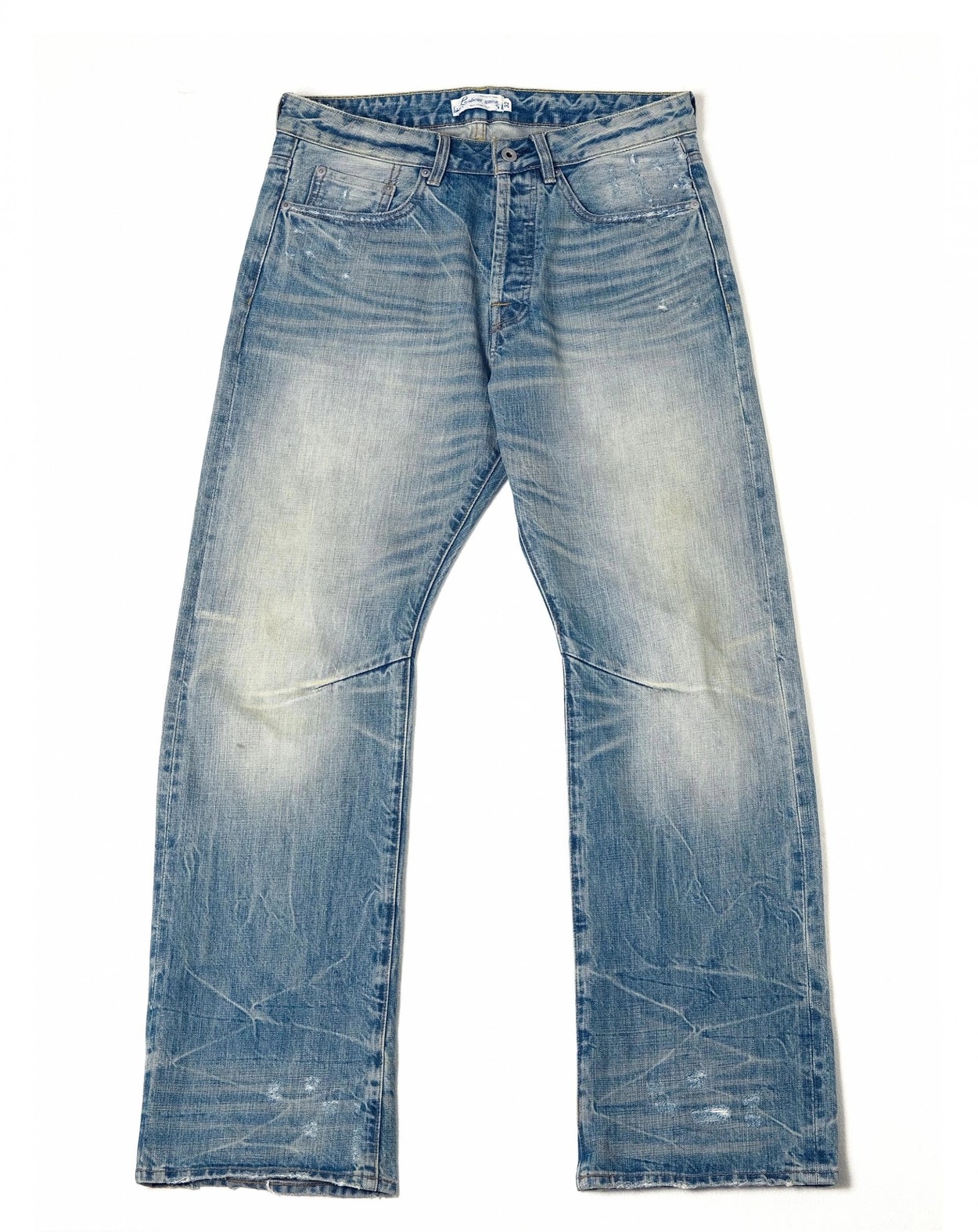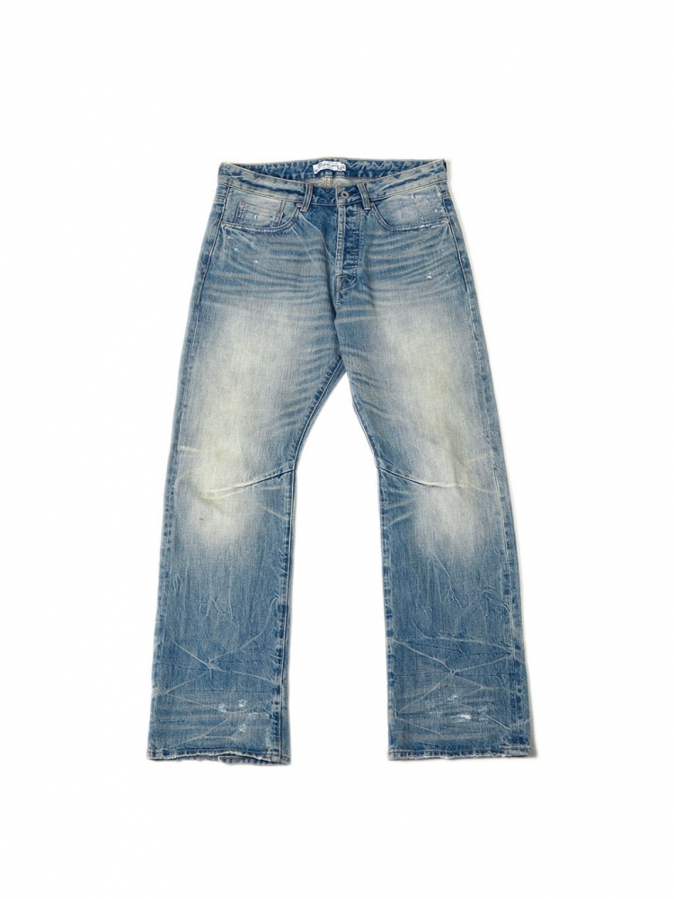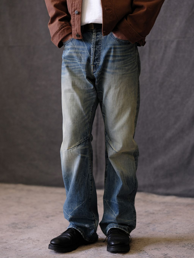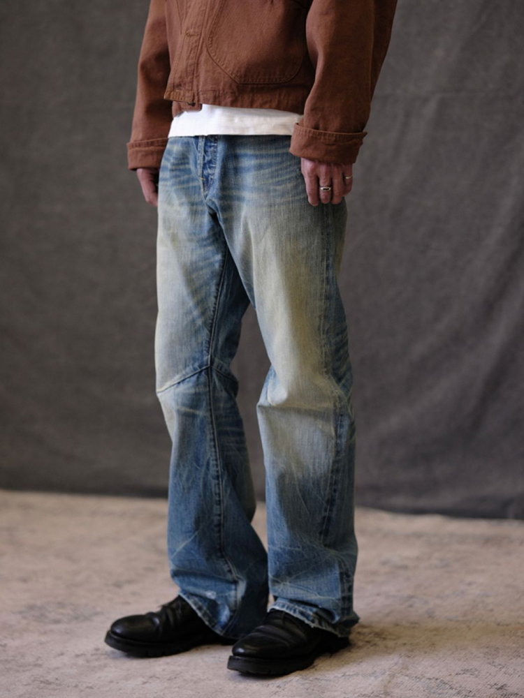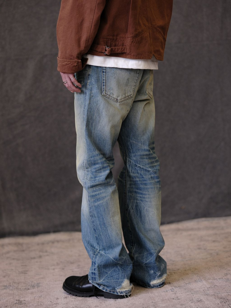 빈티지한 브러쉬 워싱과 디스트레스 디테일이 돋보이는 플레어 핏 데님 팬츠입니다. 자연스러운 퇴색과 손상 표현으로 오래 입은 듯한 무드를 연출하며, 스타일과 편안함을 모두 갖춘 시즌 필수 아이템입니다.