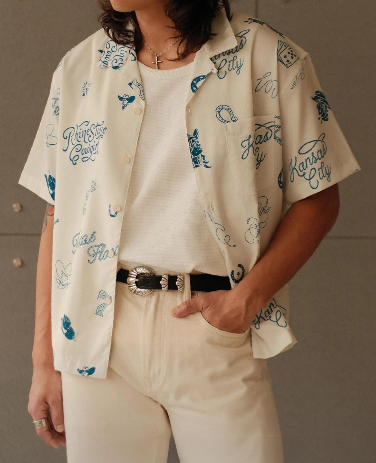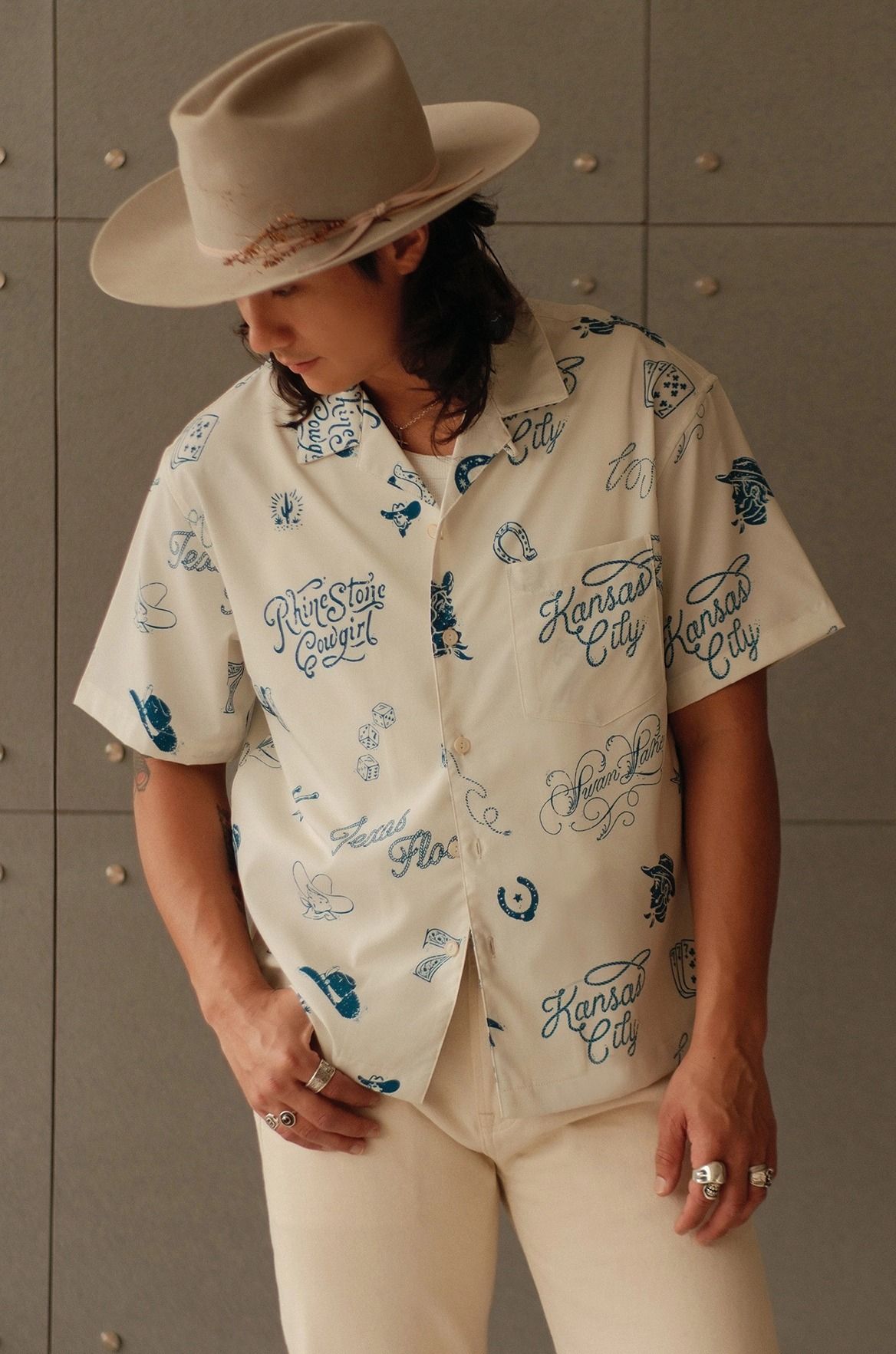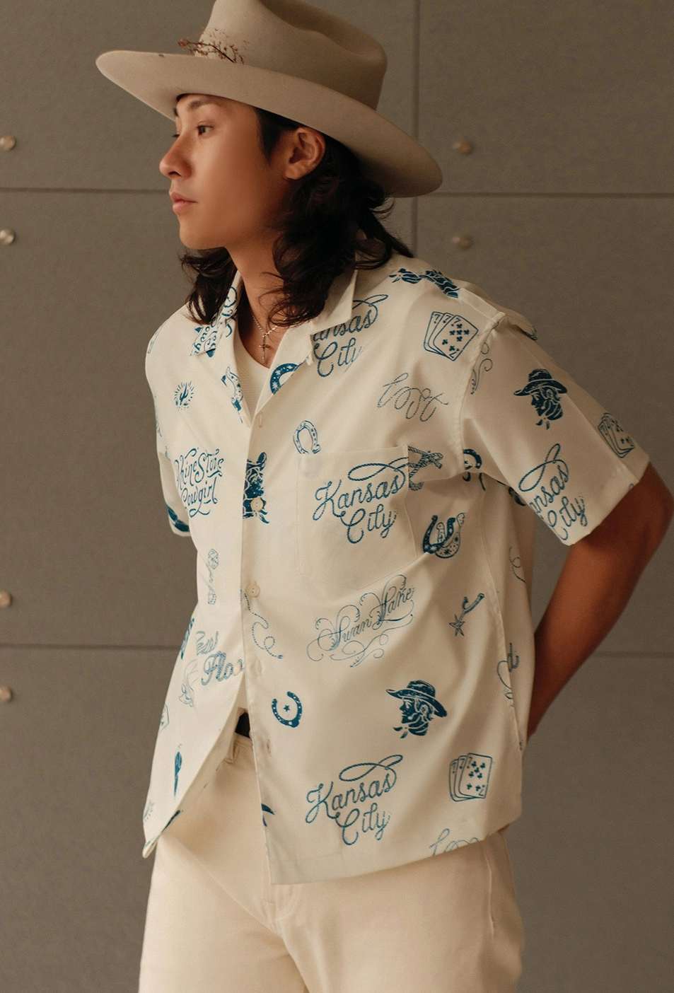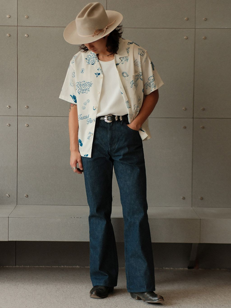 무더운 날씨에도 쾌적한 착용감을 제공하는 120g 경량 폴리 원단을 사용한 여름 셔츠입니다. 클래식한 웨스턴 무드를 기반으로, 위트 있는 레터링과 손그림 느낌의 일러스트 프린트가 감각적으로 배치되어 캐주얼하면서도 독특한 분위기를 연출합니다.