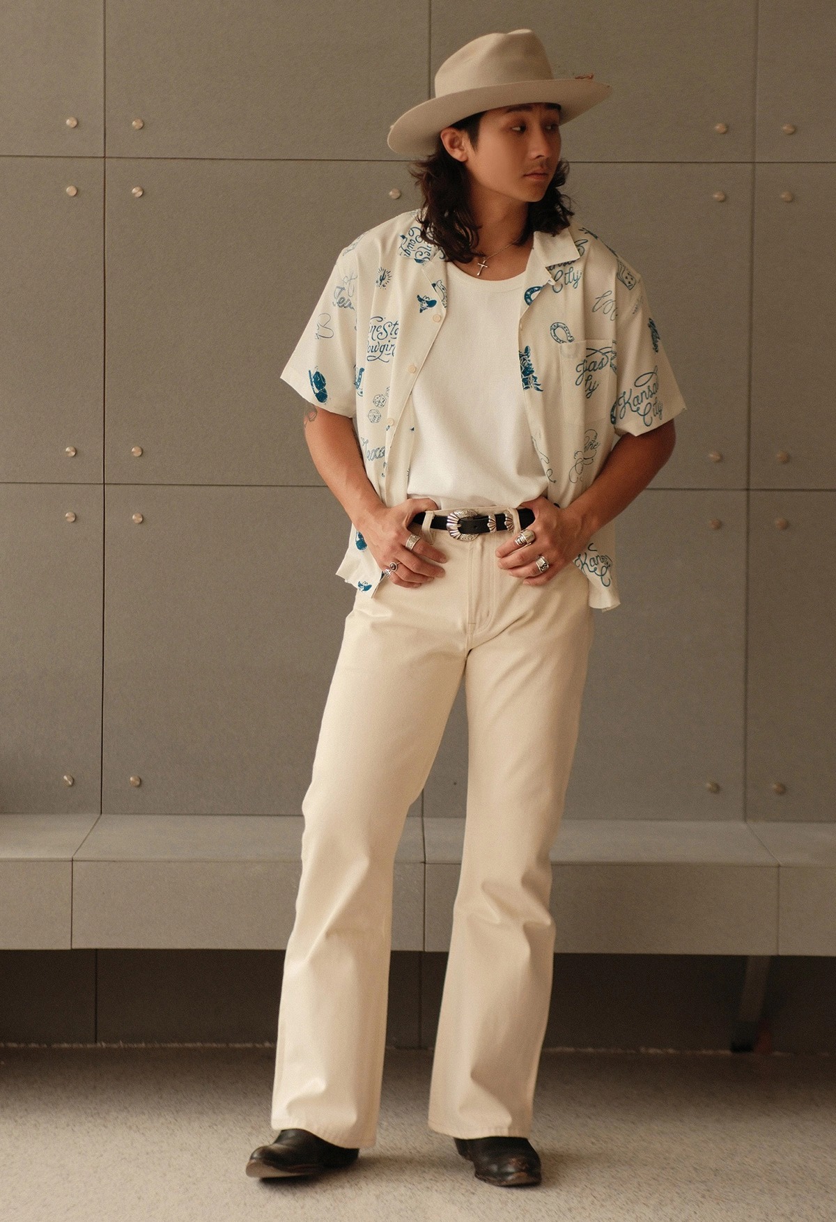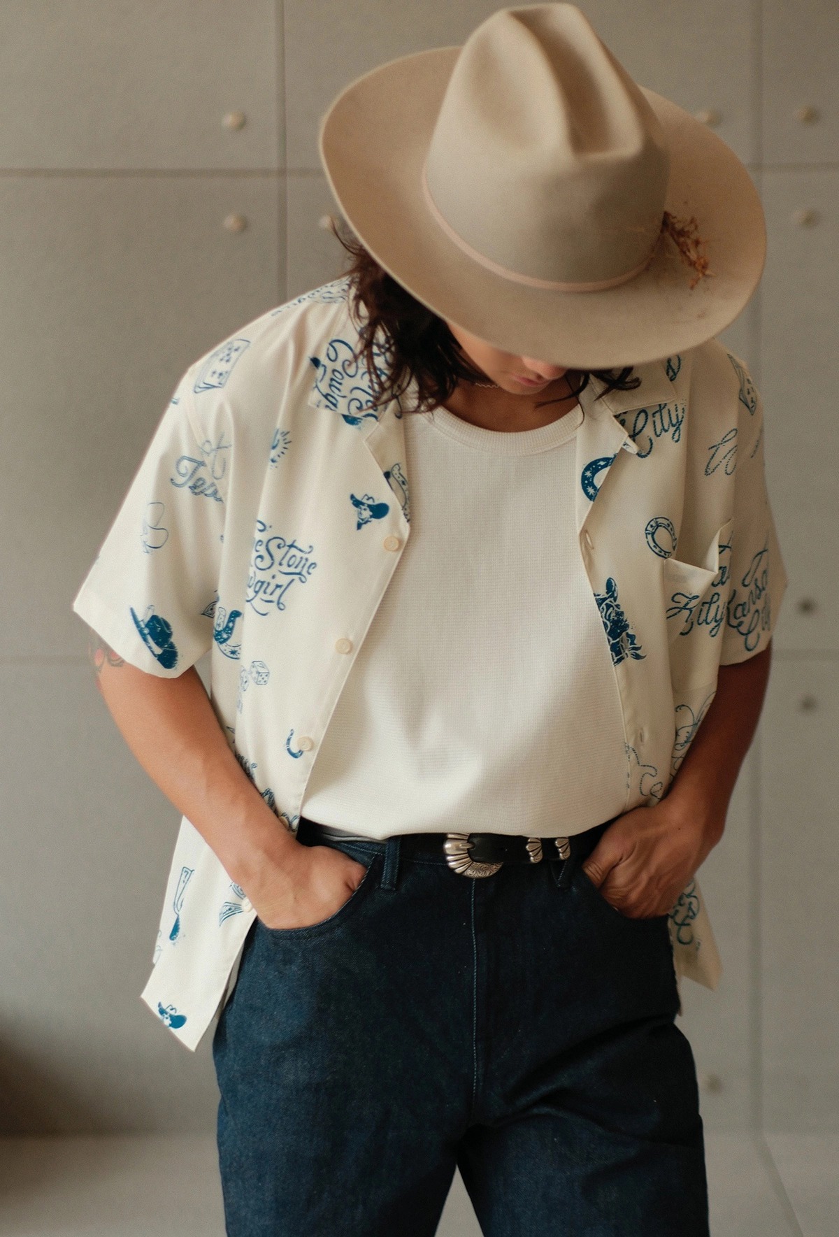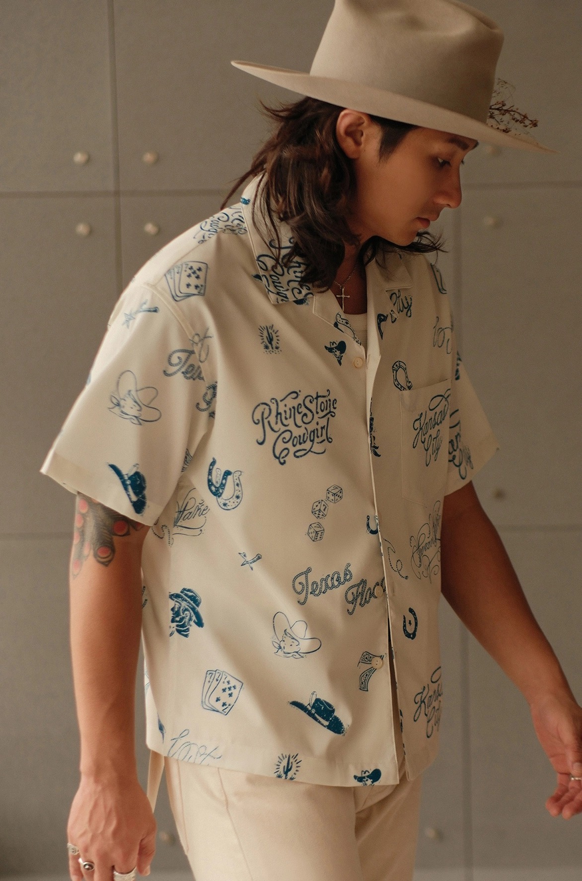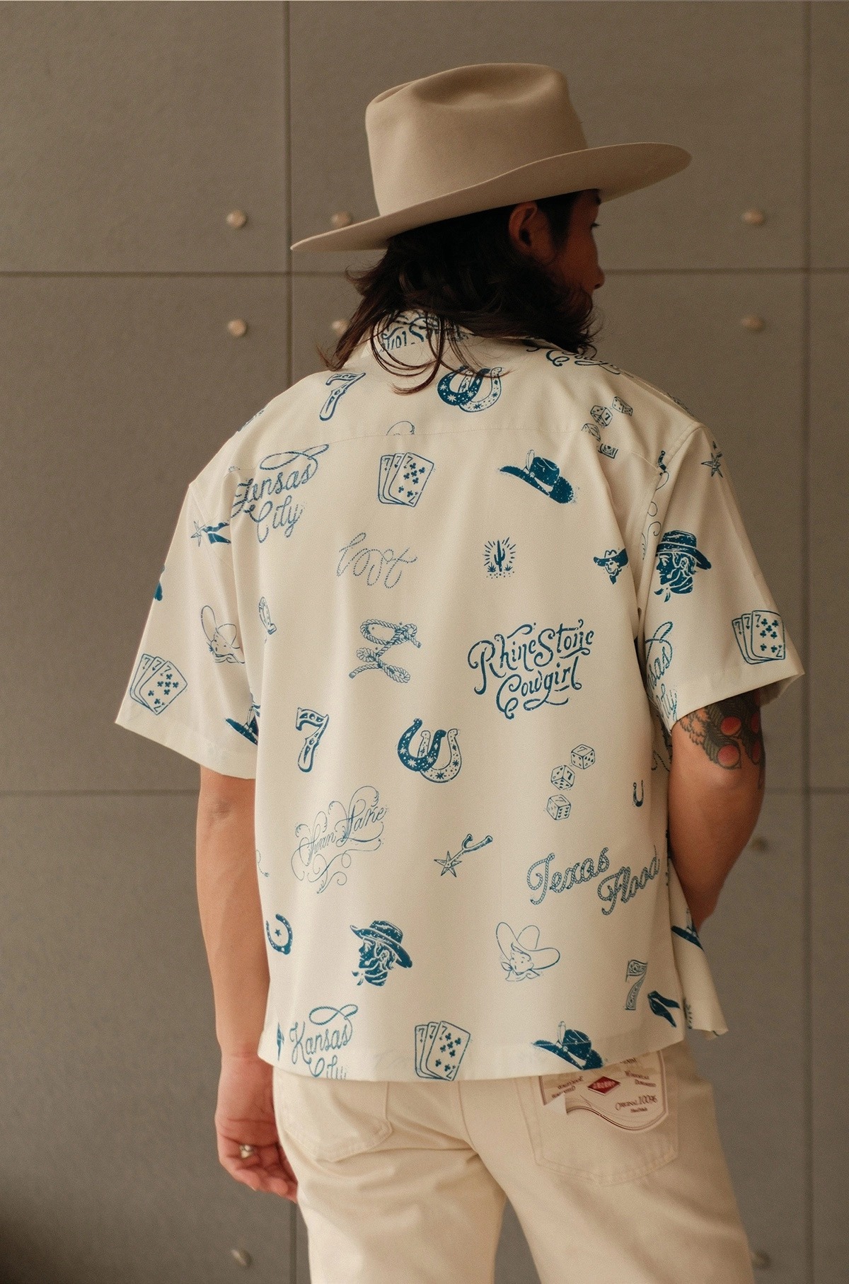 무더운 날씨에도 쾌적한 착용감을 제공하는 120g 경량 폴리 원단을 사용한 여름 셔츠입니다. 클래식한 웨스턴 무드를 기반으로, 위트 있는 레터링과 손그림 느낌의 일러스트 프린트가 감각적으로 배치되어 캐주얼하면서도 독특한 분위기를 연출합니다.