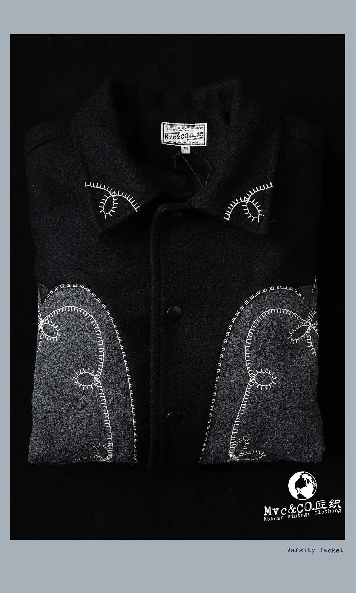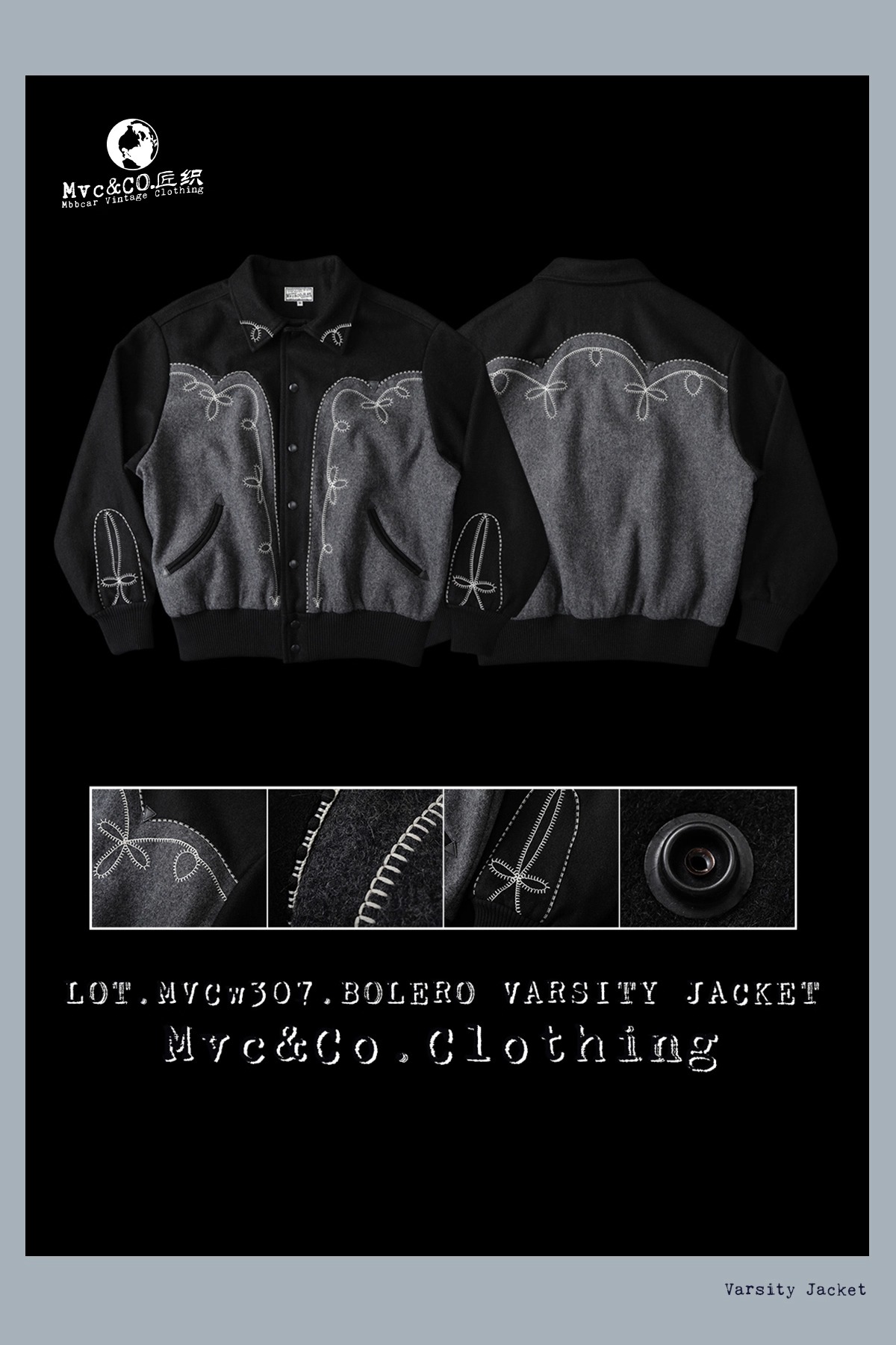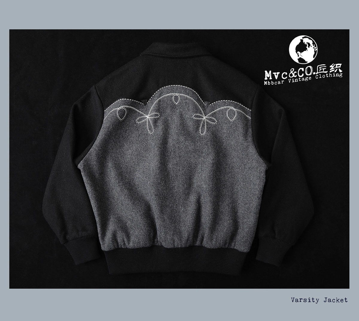 울 멜턴 위로 흐르는 볼레로 스티치, 조용한 서부의 결을 품은 MVCW307 바시티 자켓.