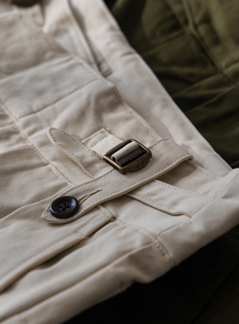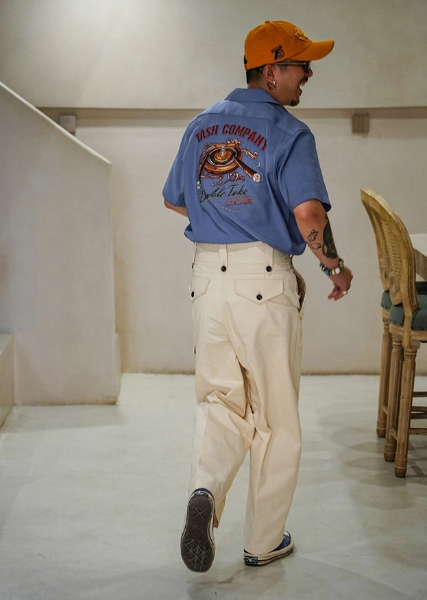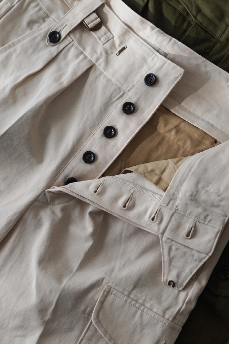 1930년대 영국군의 군복에서 영감을 받아 제작된 와이드 더블 플리츠 팬츠입니다.