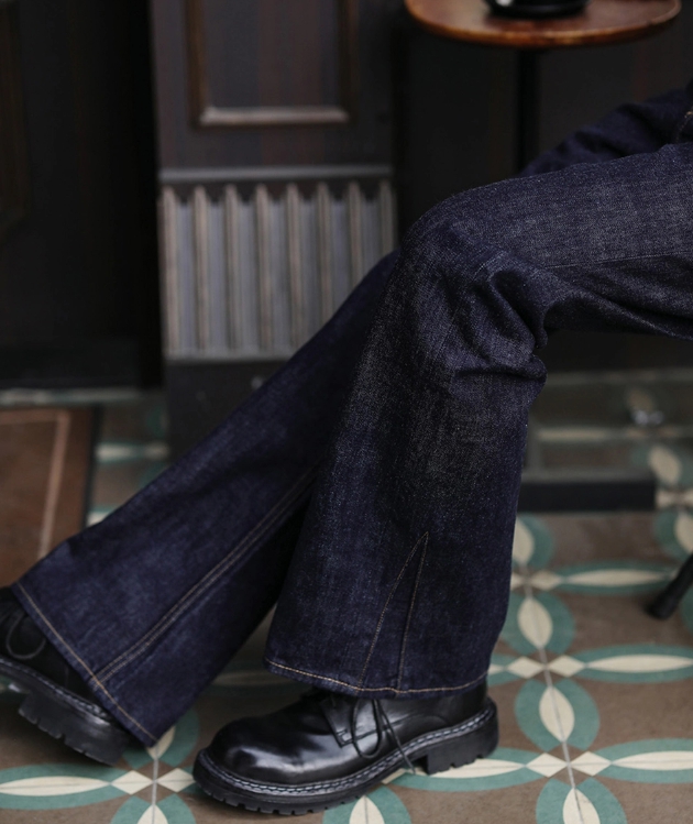 클래식한 실루엣의 세미 부츠컷 셀비지 데님 팬츠입니다.