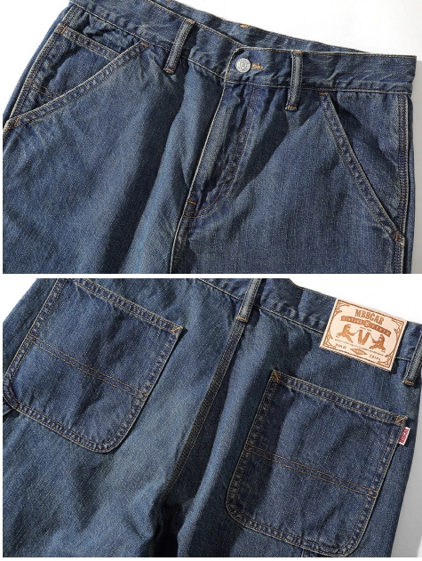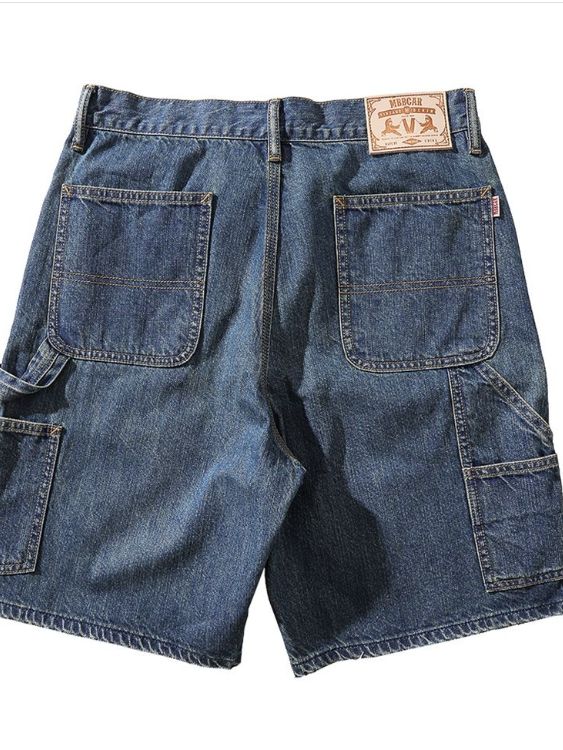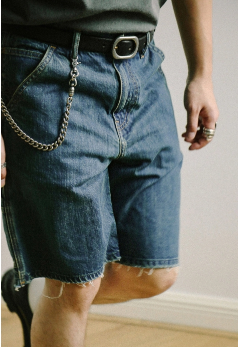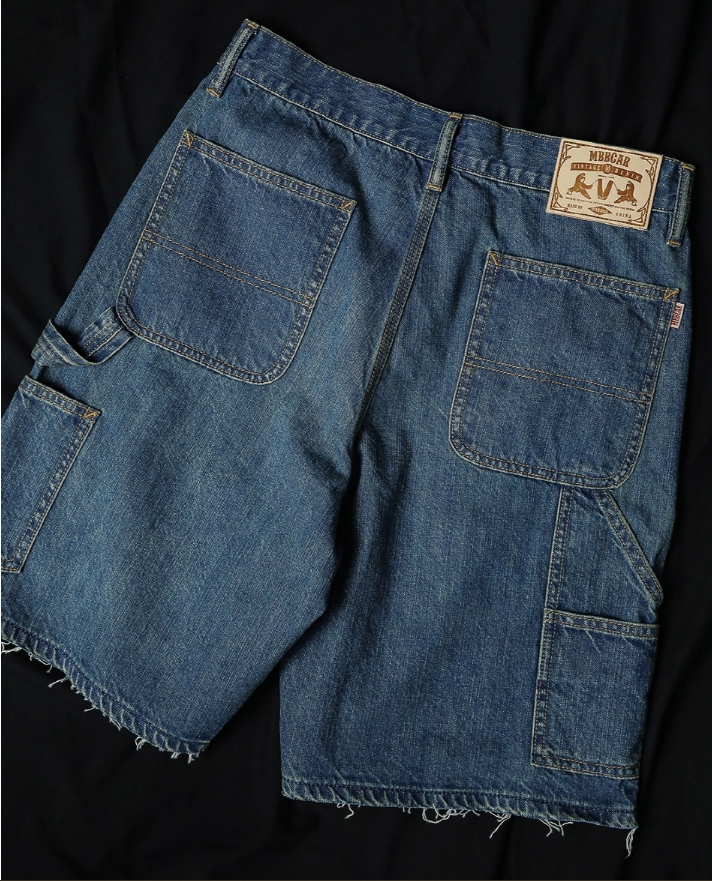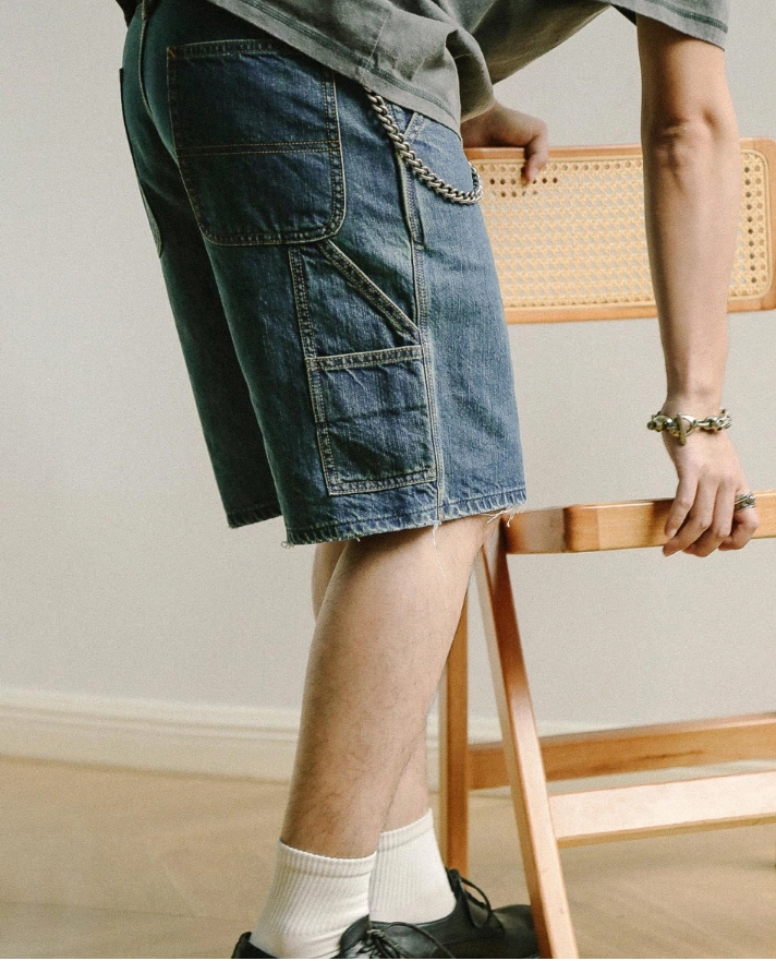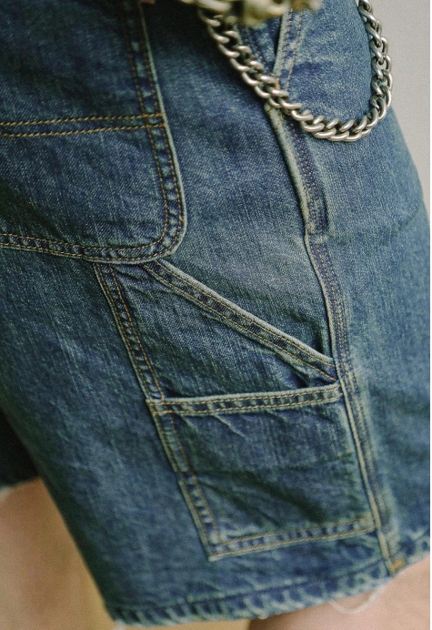 벌목공 워크웨어 포켓 디테일과 미디엄 블루 워싱으로 완성된 빈티지 무드의 포켓 숏 팬츠입니다.