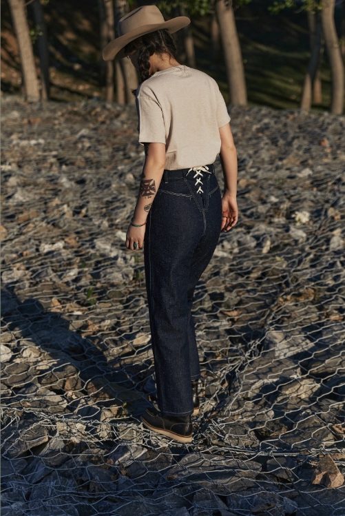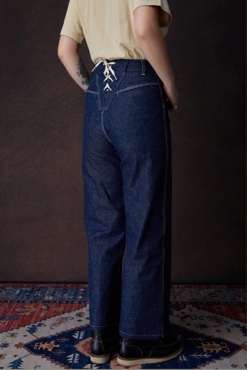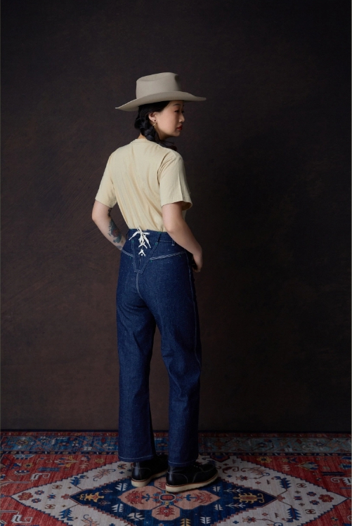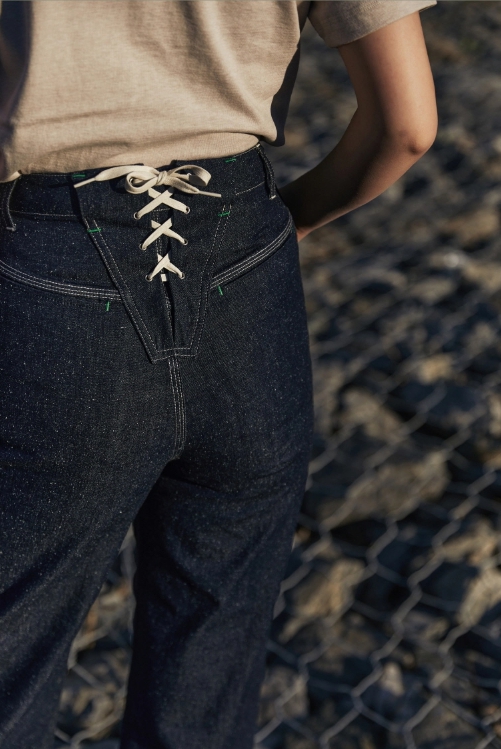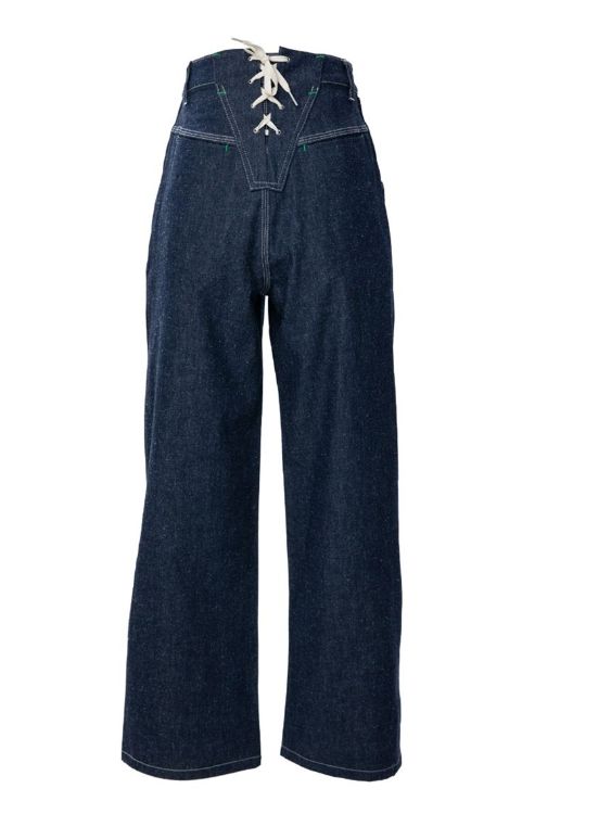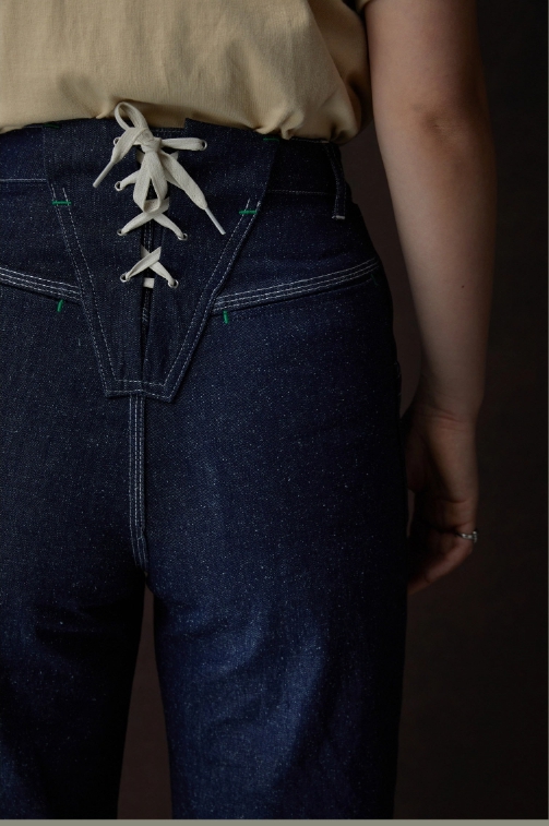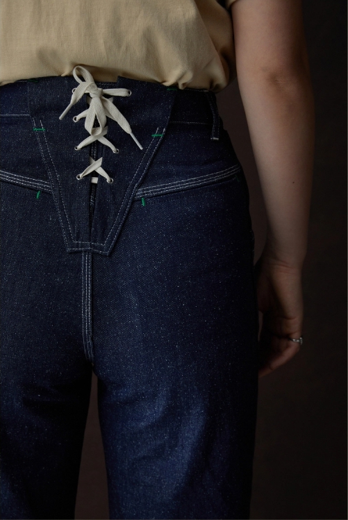 빈티지한 무드를 더한 후면 끈 디테일이 포인트인 하이웨스트 데님 팬츠입니다.
