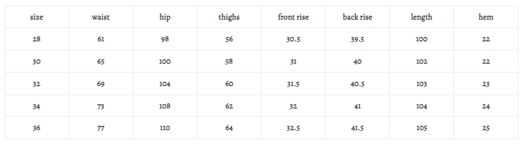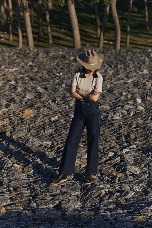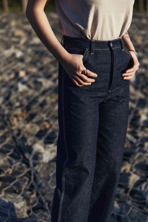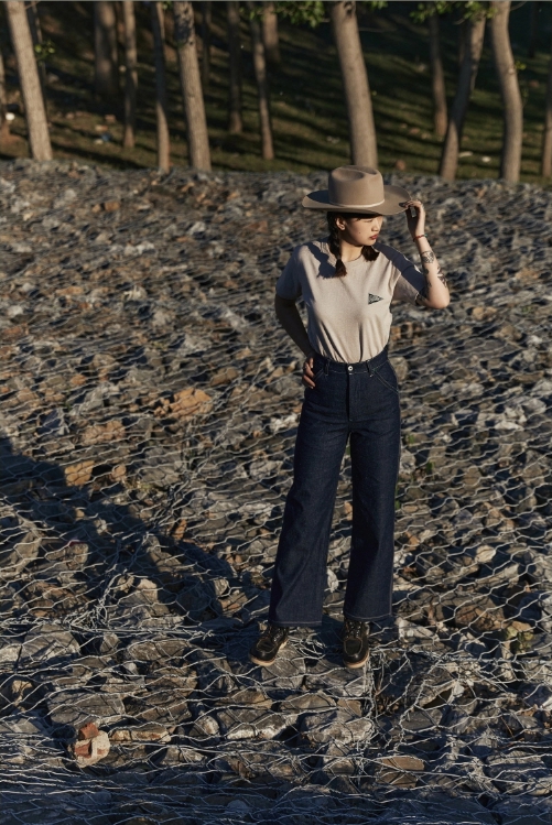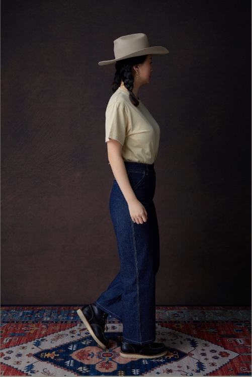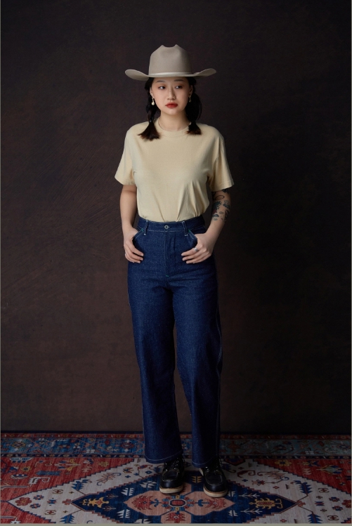 9.5oz의 적당한 두께감으로 사계절 활용 가능하며, 전체적으로 슬림하게 떨어지는 실루엣과 높은 허리선이 다리를 길어 보이게 연출해줍니다.