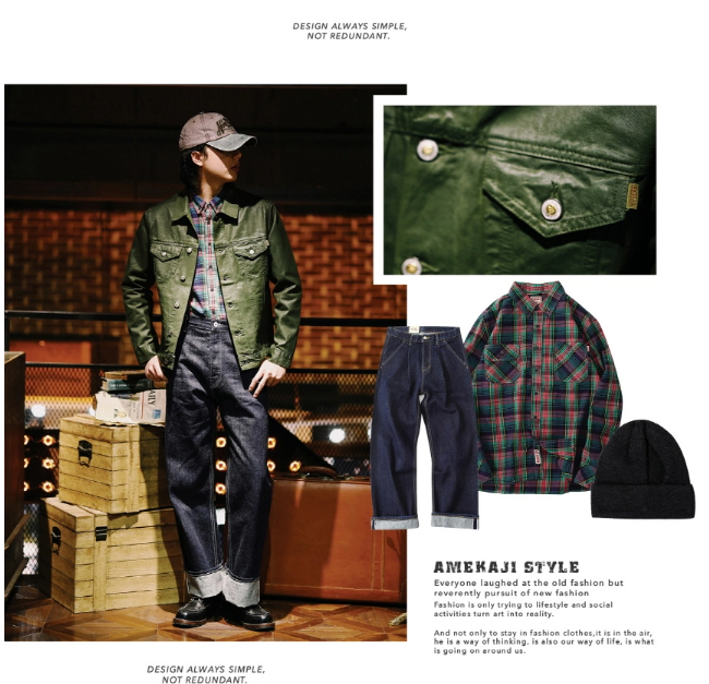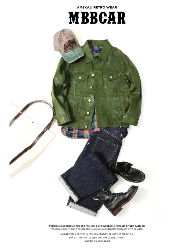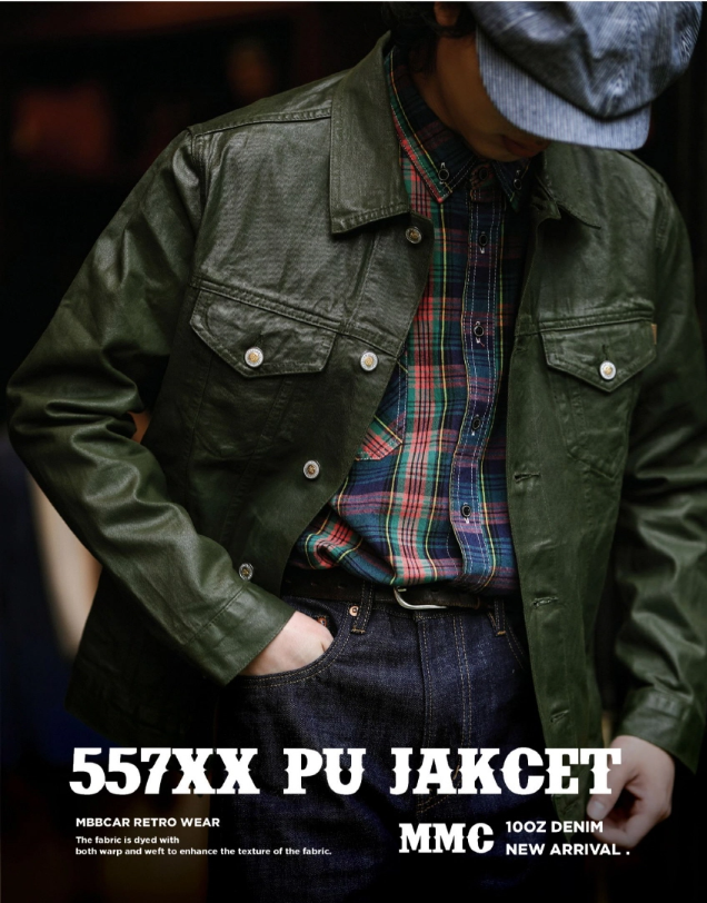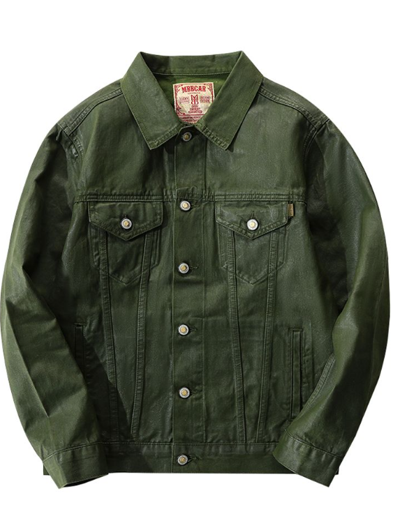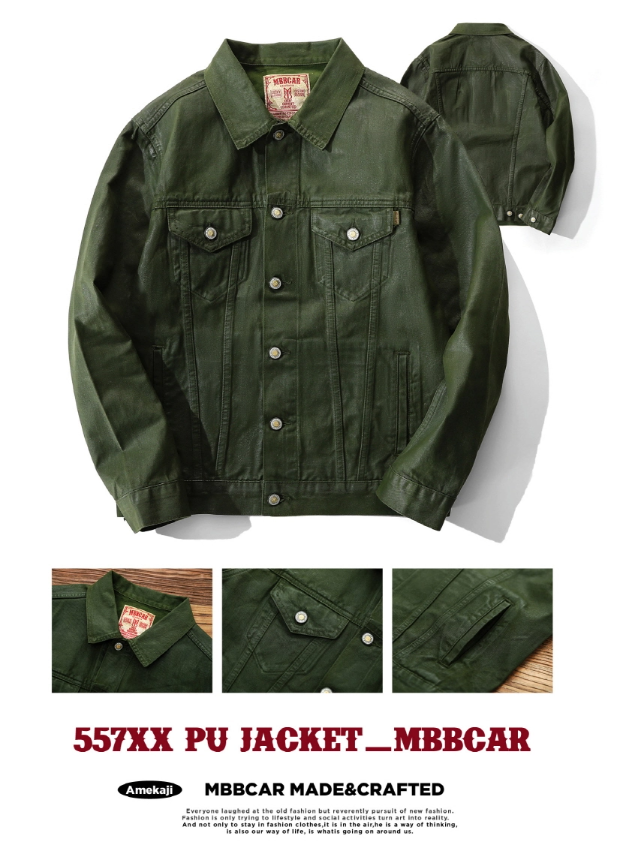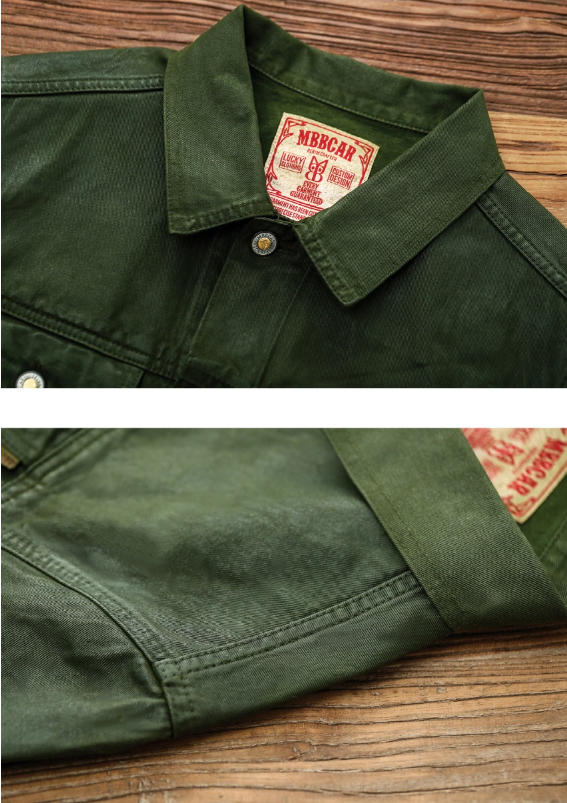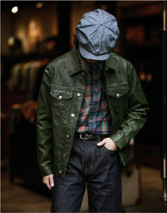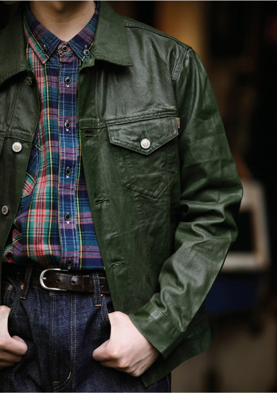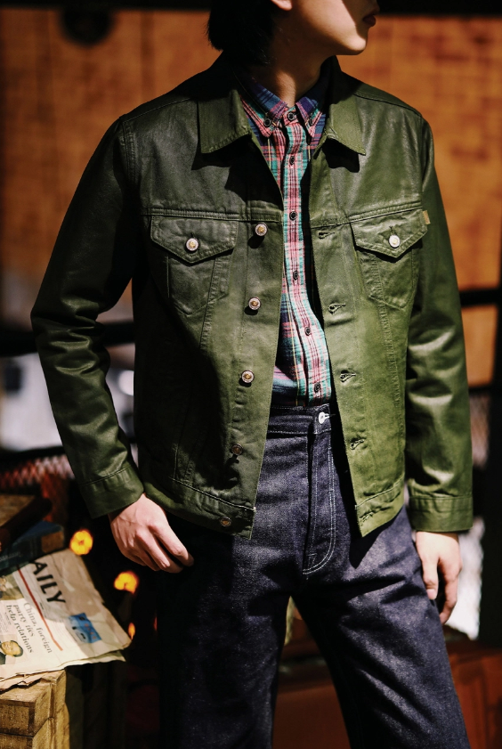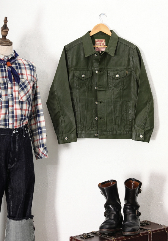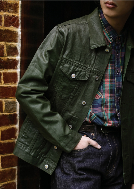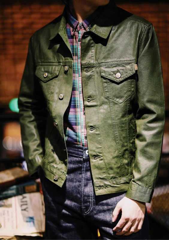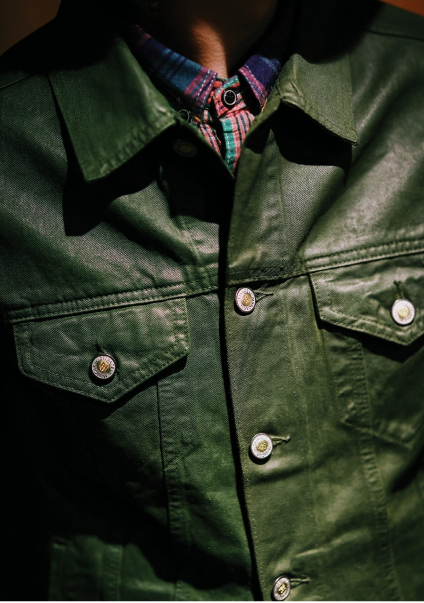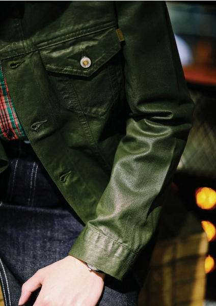 • 고급 셀비지 원단과 PU 스프레이 공정을 더해 완성한 유니크한 그린 왁스 자켓입니다.